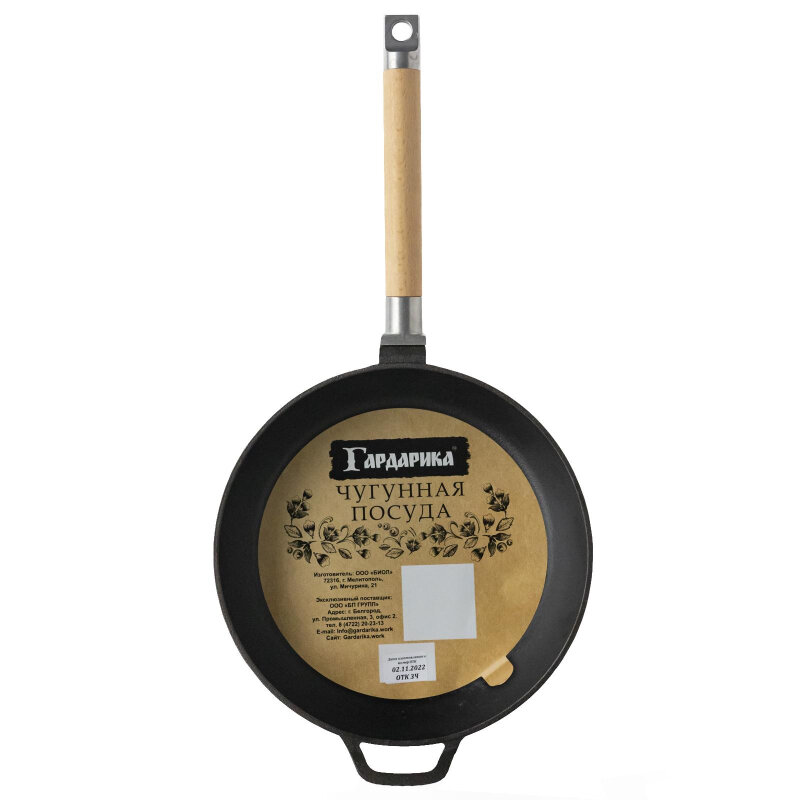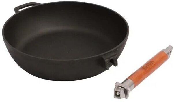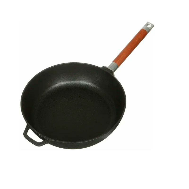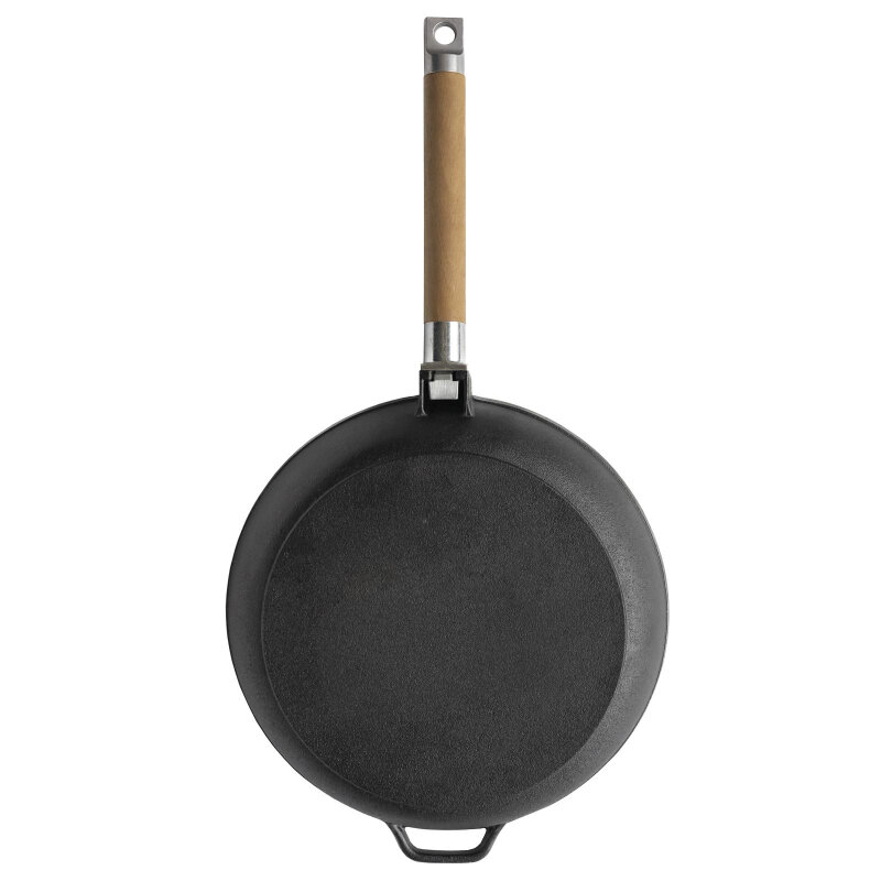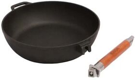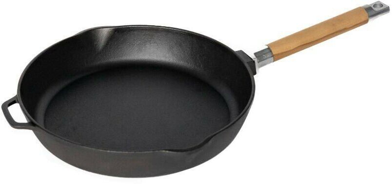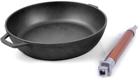 Сковорода изготовлена из натурального экологически безопасного чугуна. Чугун является одним из лучших материалов для производства посуды. Сковороду можно нагревать до высоких температур, она практична, не выделяет токсичных веществ, обладает высокой теплоемкостью и способна служить десятилетиями. Сковорода оснащена съемной деревянной ручкой. При помощи вращательного движения ручка снимается и прикручивается. Подходит для всех типов плит, включая индукционные. Нельзя мыть в посудомоечной машине. Диаметр сковороды по верхнему краю: 26 см. Высота стенки: 6,5 см. Длина ручки: 21 см.