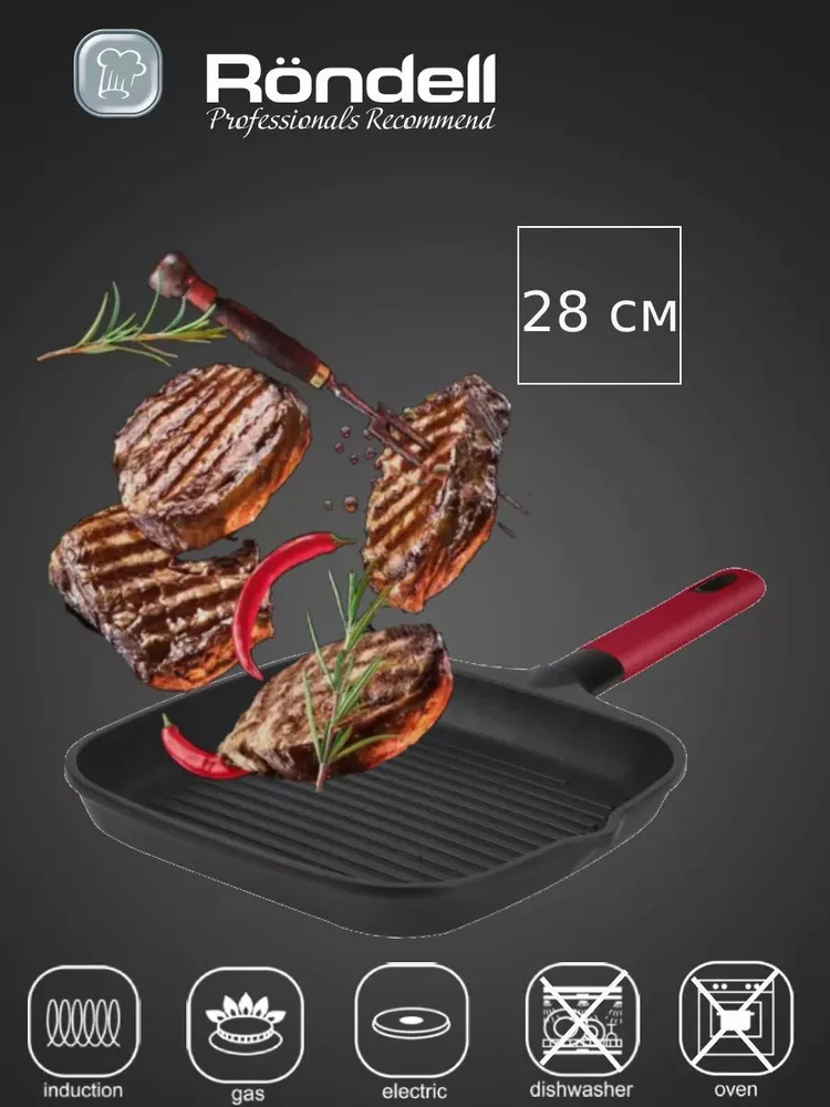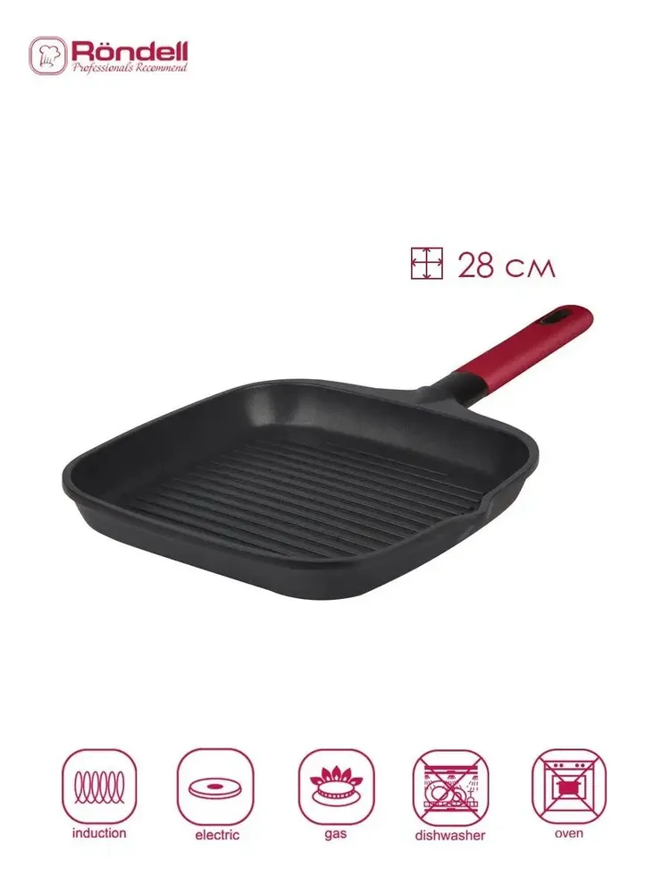 Сковородка гриль подходит для всех видов плит, включая индукционную. Сковородка гриль антипригарная не рекомендуется для приготовления пищи в духовке. Сковорода с антипригарным покрытием легко моется в теплой воде, но не подходит для посудомоечной машины. Кухонная посуда от Rondell станет отличным подарком на Новый год или день рождения любимой маме, бабушке, сестре и подруге. Вы можете наслаждаться антипригарной сковородой в течение долгих лет, гарантия 2 года.