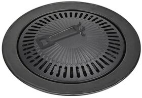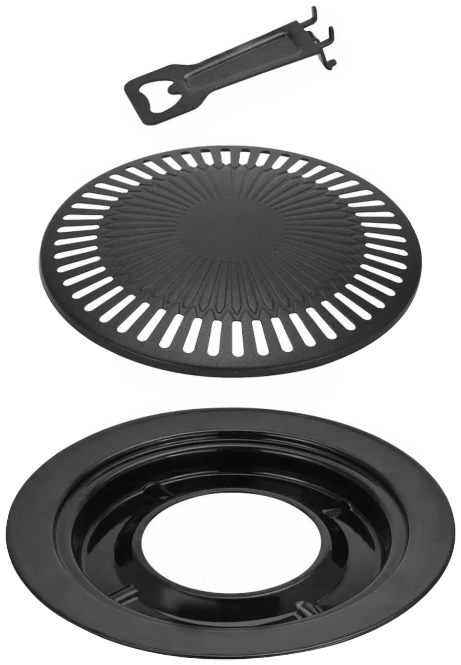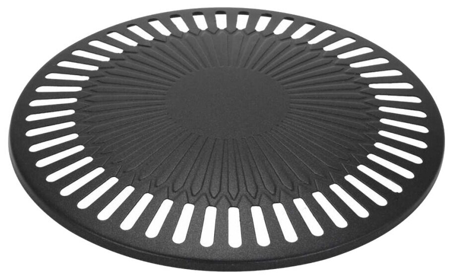 сковорода подходит только для газовых плит; материал корпуса: углеродистая сталь; внешнее покрытие: термостойкое эмалевое; материал решетки: алюминизированная сталь с антипригарным покрытием