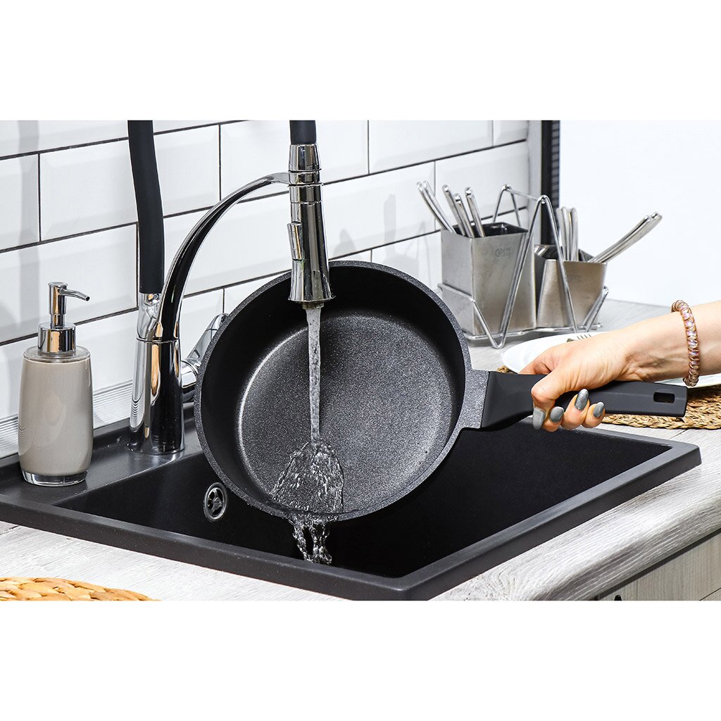 Перед использованием вымыть сковороду в горячей воде с моющим средством. Не использовать при мытье металлические и абразивные губки. При приготовлении блюд использовать только столовые приборы из силикона, дерева или пластика.