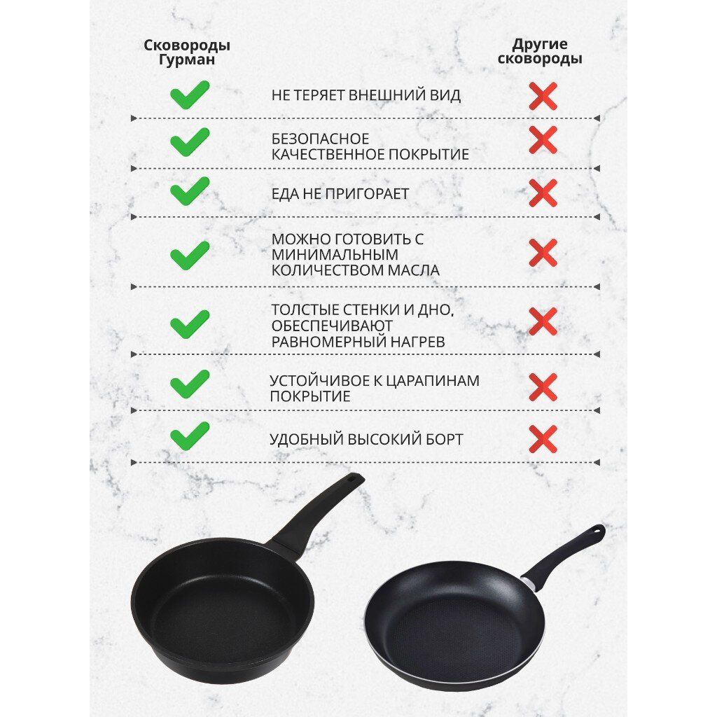 Выполненная из литого алюминия сковорода Гурман Verde благодаря быстрому нагреву поспособствует сокращению времени приготовления пищи и экономии энергии. Антипригарное покрытие сковороды при термической обработке не выделяет вредных химических веществ, порадует вас прочностью и долговечностью.