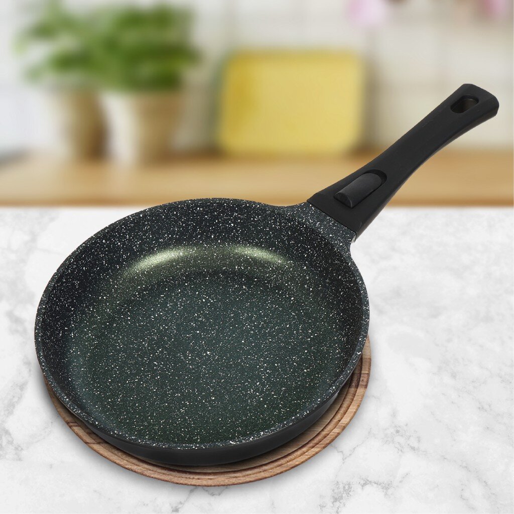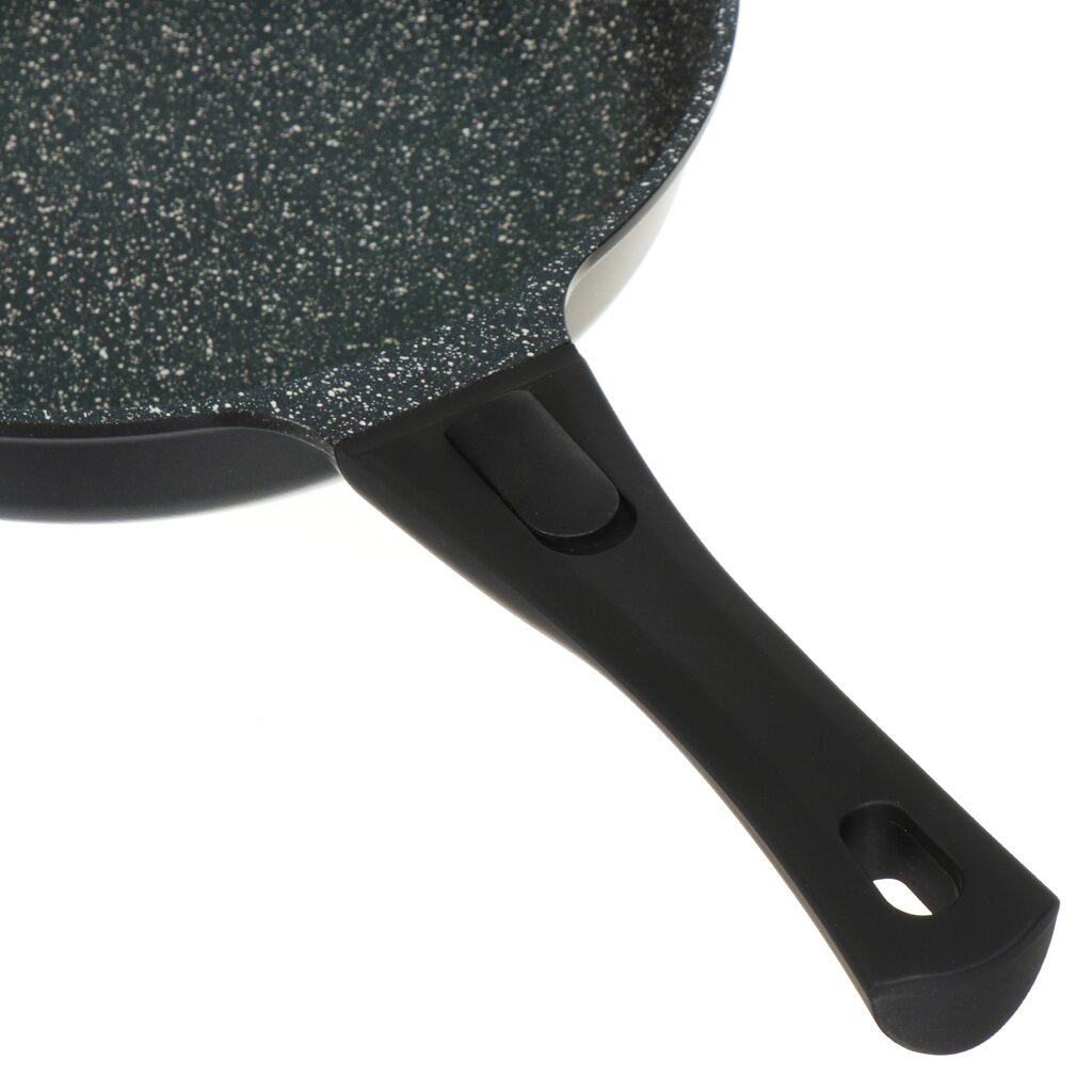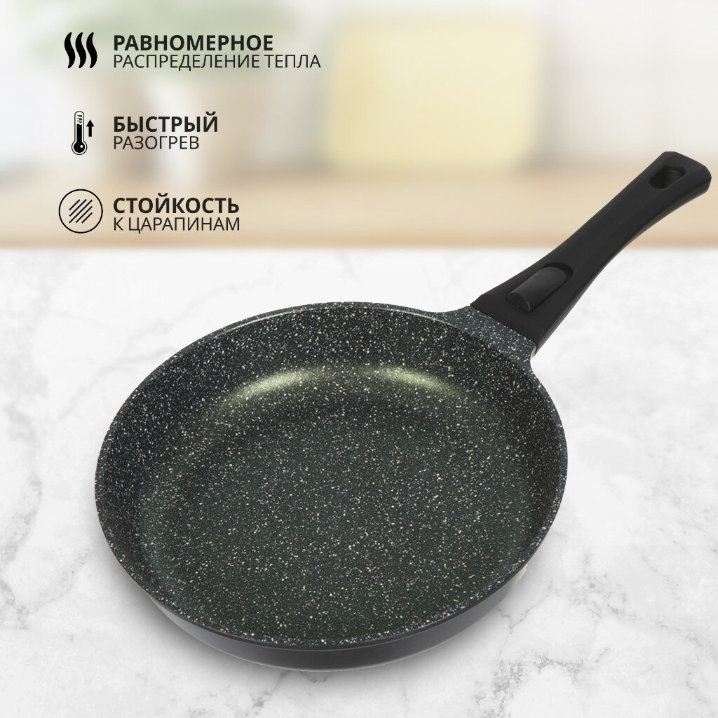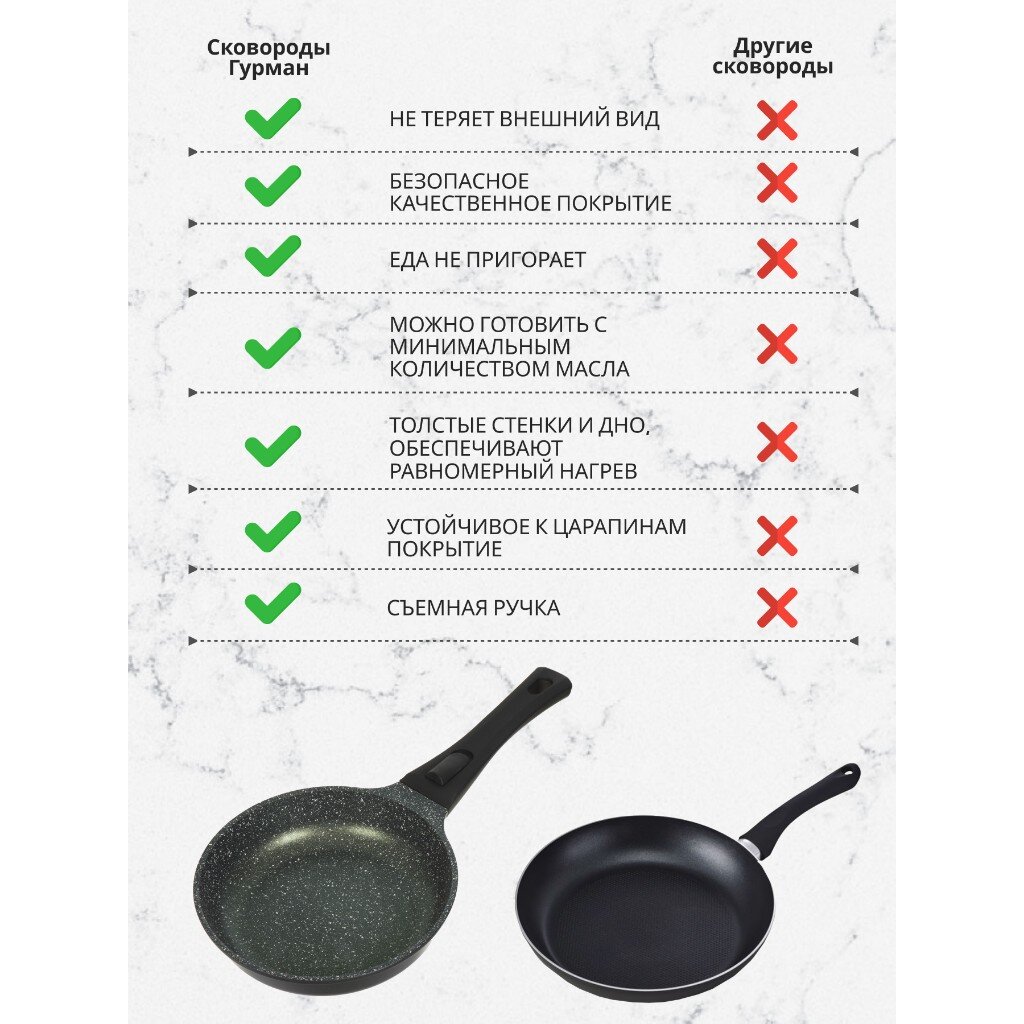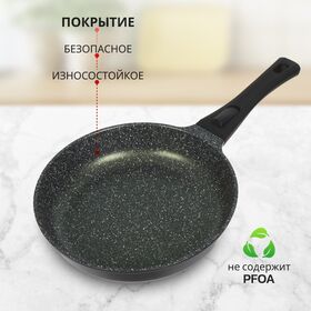 Сковорода выполнена литьем вручную из пищевого алюминия и имеет сверхпрочное семислойное антипригарное покрытие, безопасное для здоровья. Антипригарное покрытие обладает высокой прочностью к истиранию, что увеличивает срок службы сковороды в 5 раз. Форма сковороды обеспечивает устойчивость к деформации при длительном использовании. Дно оптимальной толщины 5 мм способствует равномерному распределению тепла для наилучшего приготовления ваших блюд. Сковорода имеет удобную ручку, которая не нагревается при эксплуатации. Посуда легко и быстро моется благодаря гладкой непористой поверхности. Сковорода не содержит PFOA, при нагревании не выделяются вредные токсичные и канцерогенные вещества.