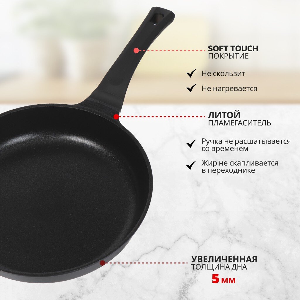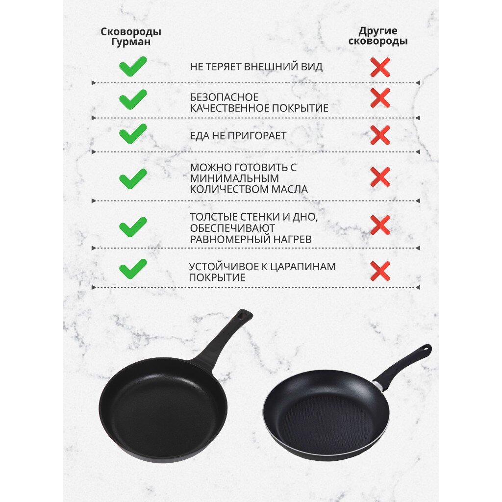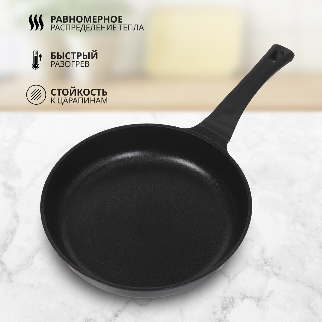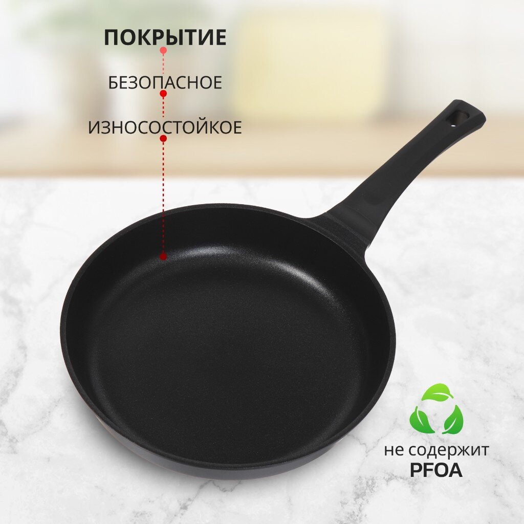 Сковорода выполнена литьем вручную из пищевого алюминия и имеет сверхпрочное семислойное антипригарное покрытие, безопасное для здоровья. Антипригарное покрытие обладает высокой прочностью к истиранию, что увеличивает срок службы сковороды в 5 раз. Форма сковороды обеспечивает устойчивость к деформации при длительном использовании. Дно оптимальной толщины 5 мм способствует равномерному распределению тепла для наилучшего приготовления ваших блюд. Сковорода имеет удобную ручку, которая не нагревается при эксплуатации. Посуда легко и быстро моется благодаря гладкой непористой поверхности. Сковорода не содержит PFOA, при нагревании не выделяются вредные токсичные и канцерогенные вещества.