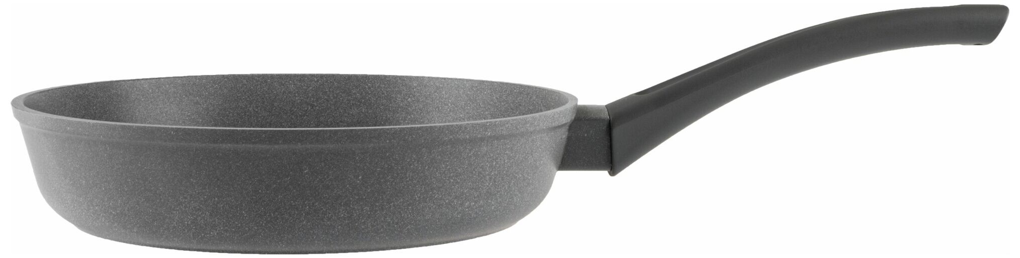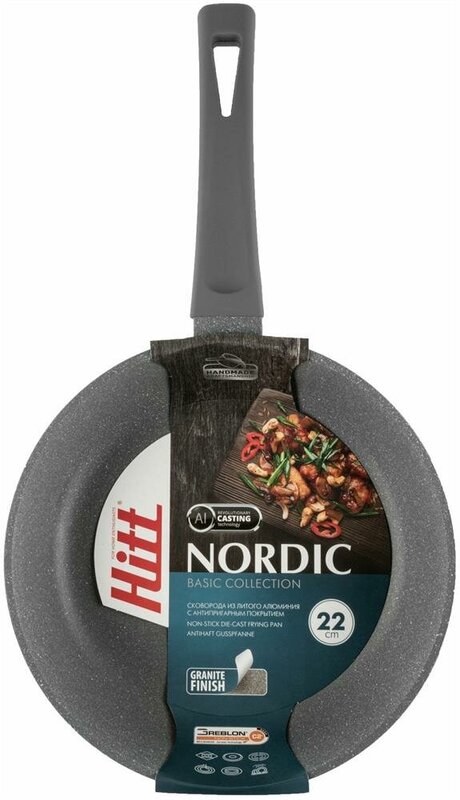 Сковорода Hitt Nordic изготовлена из литого алюминия методом ручного литья. Обладает прекрасными техническими характеристиками: толщина дна 5 мм, толщина стенок 3,5 мм, высокий борт, отличное двухслойное антипригарное покрытие немецкой марки Greblon C2+ с эффектом гранитной крошки. Рекомендуется для ежедневного интенсивного использования. Характеризуется повышенной износостойкостью. Толстые стенки и дно сковороды удерживают температуру нагрева. Ручка эргономичной формы с мягким силиконовым покрытием soft-touch не нагревается и обеспечивает хорошую фиксацию.
