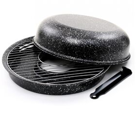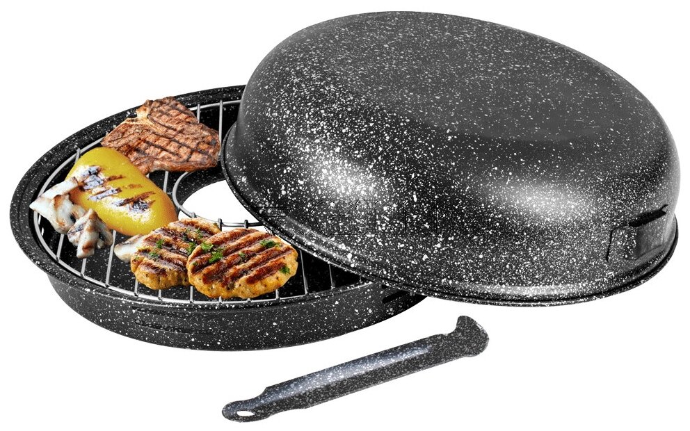 сковорода, решетка-гриль, крышка со съёмной ручкой, инструкция с рецептами