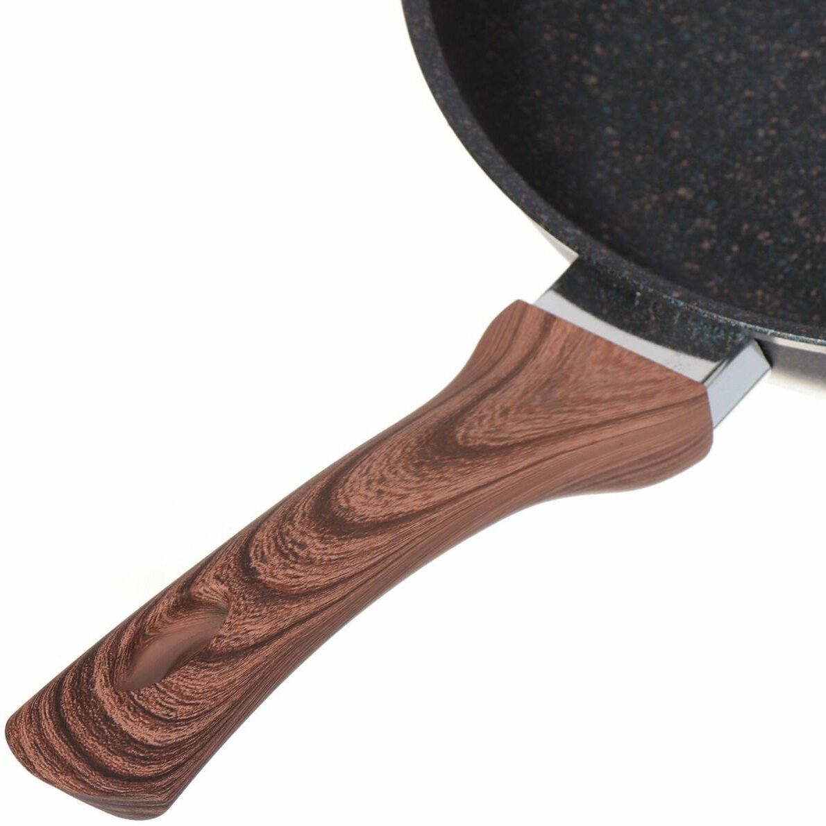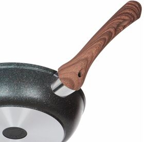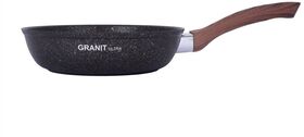 Сковорода диаметром 26см с пластиковой ручкой (бакелитовое покрытие), диаметр дна 19см, высота бортов 6см, толщина дна 6мм, толщина бортов 4,5мм, изготовлена из литого алюминия и покрыта уникальным ультрапрочным антипригарным покрытием «Ultra granit».