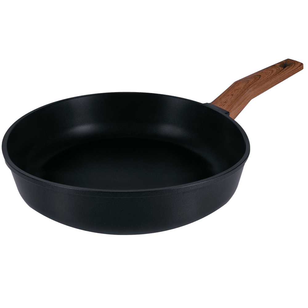 Сковорода выполнена в классическом черном цвете, ручка с отделкой под дерево, будет отлично сочетаться с любой кухней.