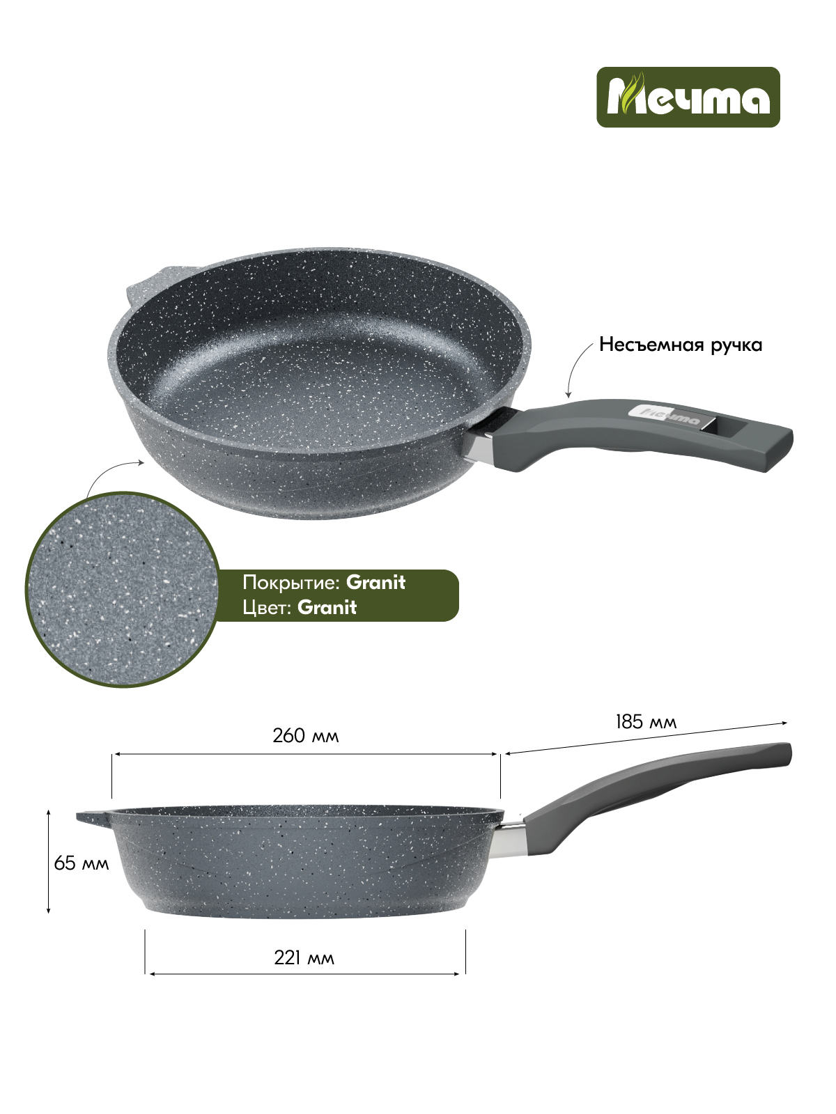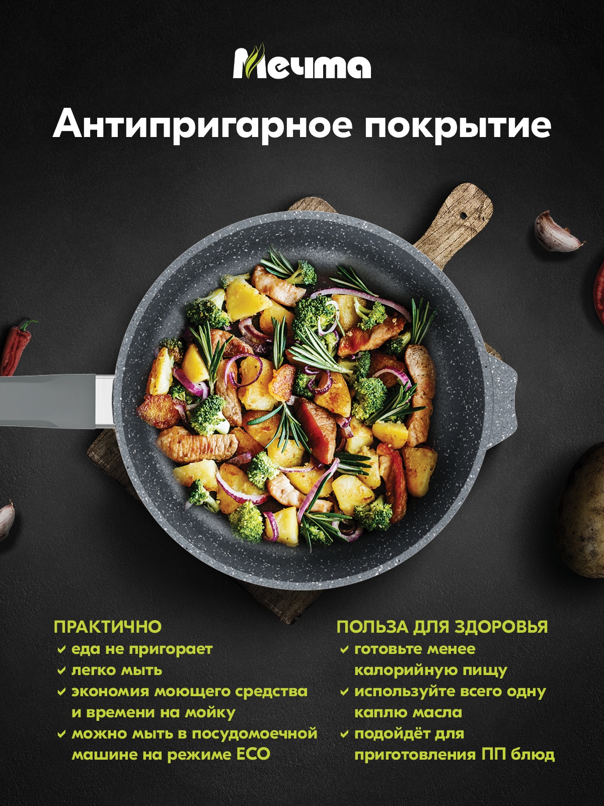 Посуда линейки Гранит от торговой марки Мечта подходит для газовых, электрических, стеклокерамических плит, мытья в посудомоечной машине (согласно инструкции по эксплуатации).