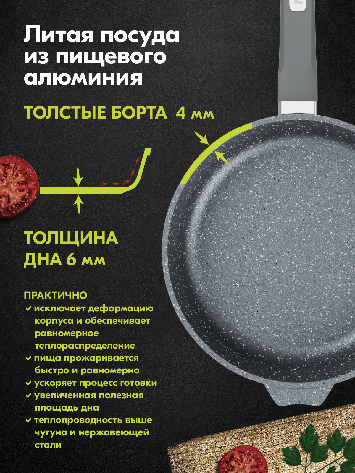 Массивное дно и стенки сковороды не подвержены деформации, царапинам и сколам за счет применения особой технологии производства.