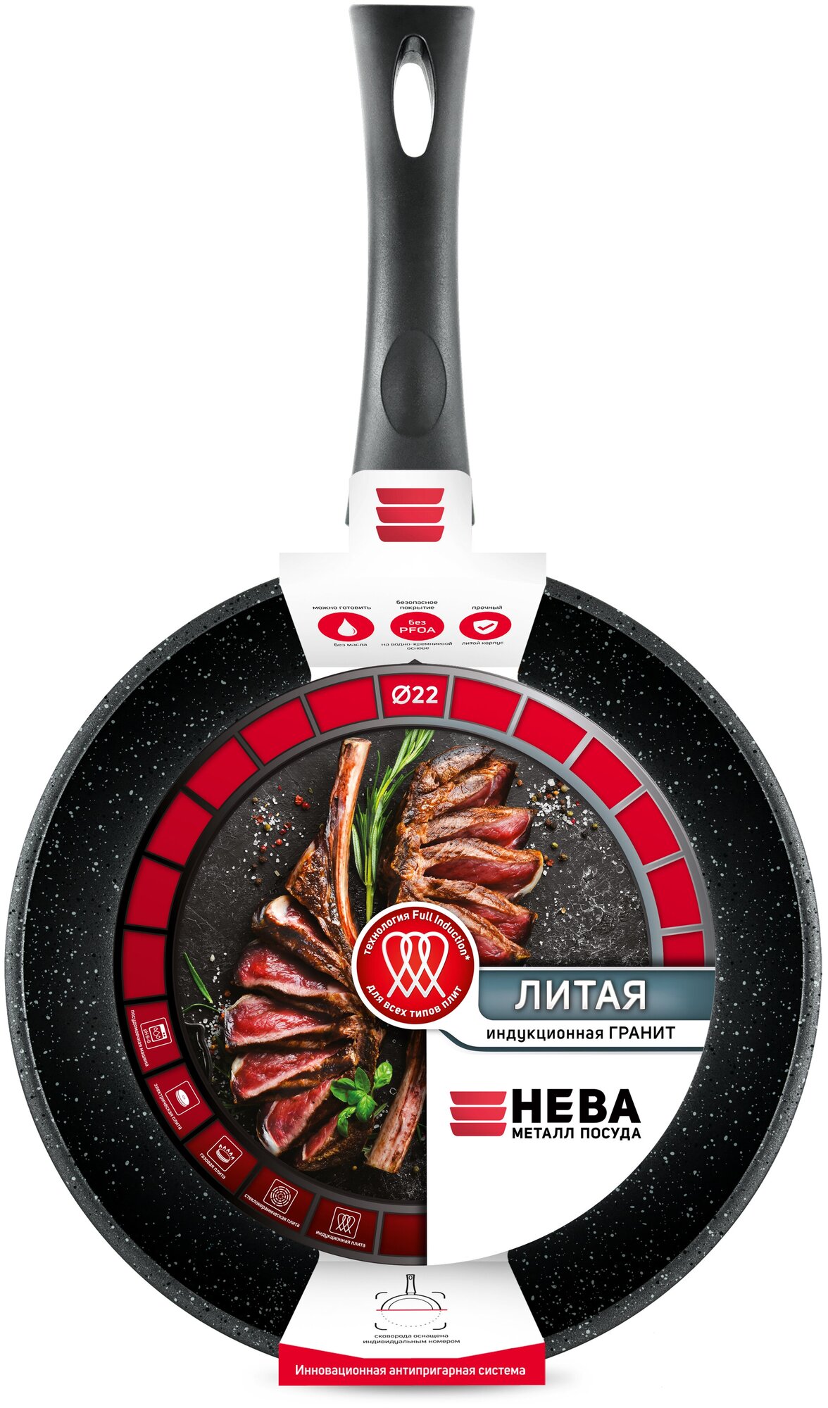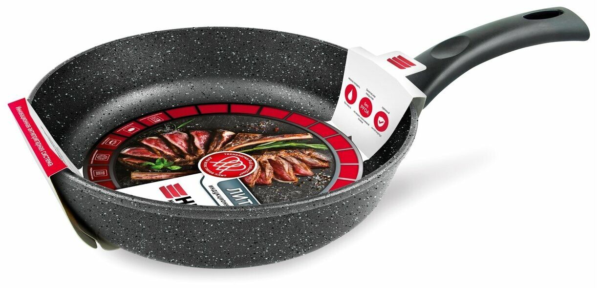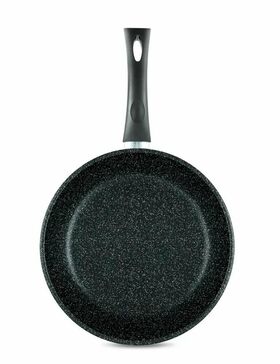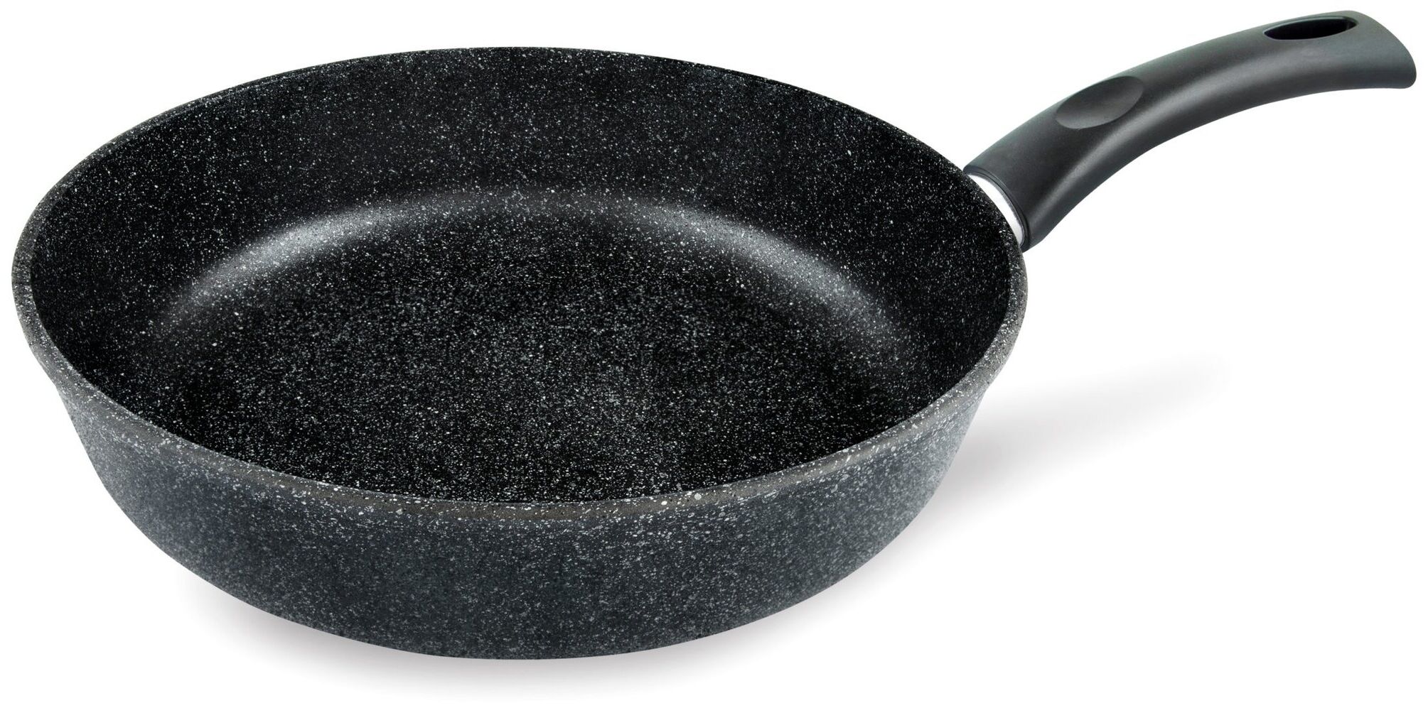 Сковорода обладает диаметром 22 см и станет надежной помощницей для ежедневного приготовления домашней пищи. Дно с цельным ферромагнитным диском распознается всеми типами индукционных плит и способствует быстрому разогреву. Корпус из литого алюминия гарантирует устойчивость посуды к механическим повреждениям и деформации. Внутреннее антипригарное покрытие с эффектом натурального камня позволяет готовить с небольшим количеством масла и повышает удобство в эксплуатации. Сковорода оборудована ненагревающейся ручкой из бакелита и подходит для мытья в посудомоечной машине.