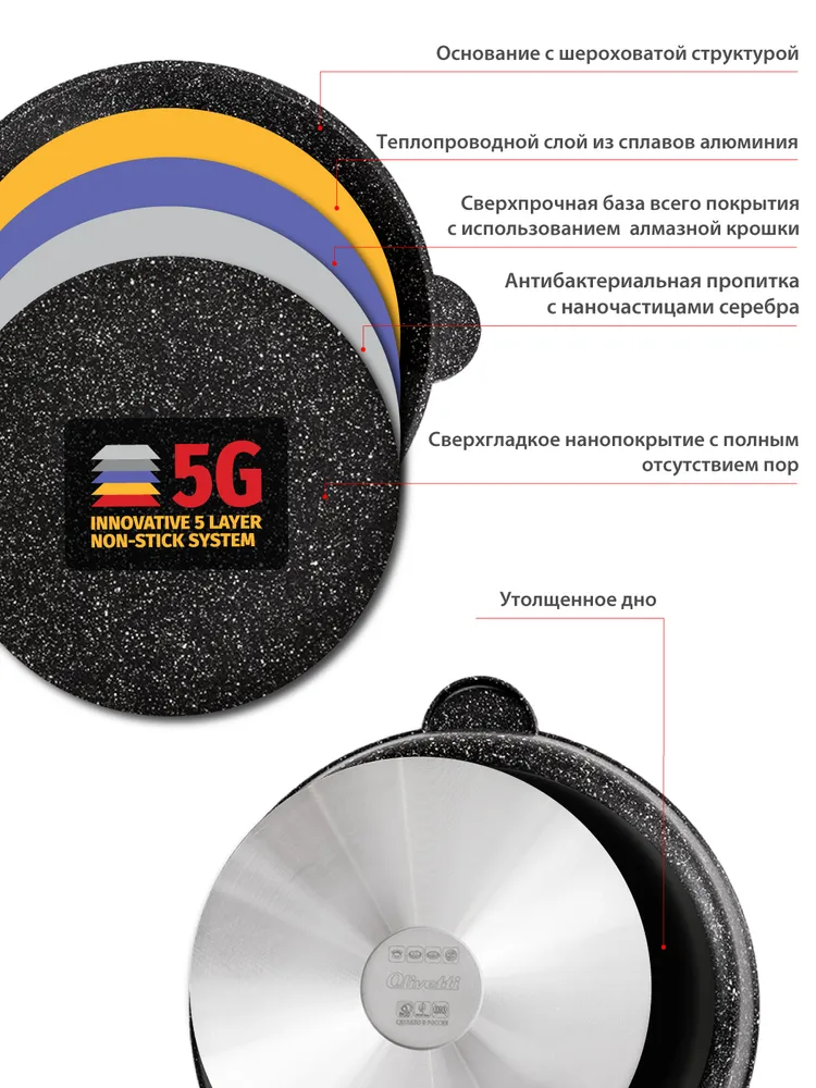 Сковорода-гриль Olivetti со съемной ручкой, антипригарной системой 5G станет безупречным помощником для каждой хозяйки. Посуда Olivetti с инновационной системой 5G разработана в соответствии с высокими требованиями к экологичности, надежности и безопасности приготовления.