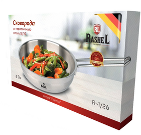 Сковороды торговой марки "RASHEL" выполнены из высококачественной нержавеющей стали (18/10 - соотношение хром/никель). Сковороды удобны в использовании, за ними легко и просто ухаживать. Многослойное капсульное дно равномерно распределяет тепло и долгое время сохраняет достигнутую температуру, тем самым обеспечивает равномерный нагрев и равномерную подачу тепла во внутрь кастрюли.