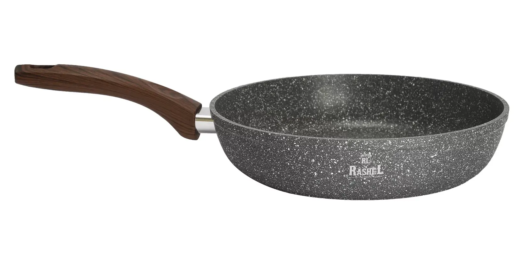 Сковороды ТМ RASHEL выполнены из высококачественного пищевого алюминия.Внутреннее и внешнее сверхпрочное, гранитное, антипригарное покрытие ТИТАН&ГРАНИТ.