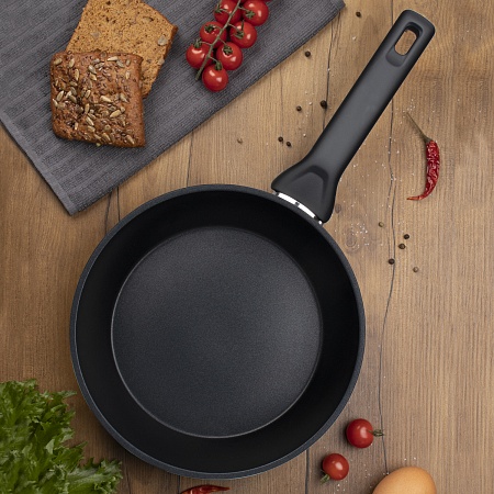 Высокие антипригарные свойства покрытия PPG Xylan Plus позволяют готовить пищу с минимальным количеством масла. Антипригарное покрытие не содержит PFOA. Бакелитовая ручка с soft-touch не нагревается при использовании конфорки, не превышающей диаметр дна сковороды.