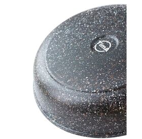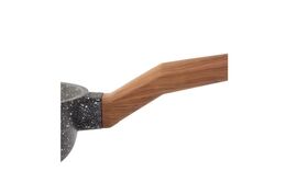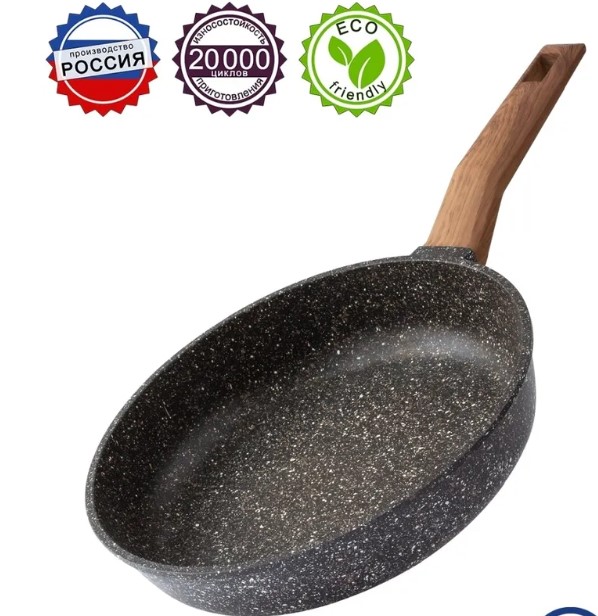 Фиксированная эргономичная ручка с покрытием Soft-touch, стилизованная под дерево благородных пород, приятная на ощупь, не нагревается и не скользит даже в мокрой руке. Глубокая сковорода - сотейник подходит для обжарки, для тушения и для приготовления с минимальным количеством масла.