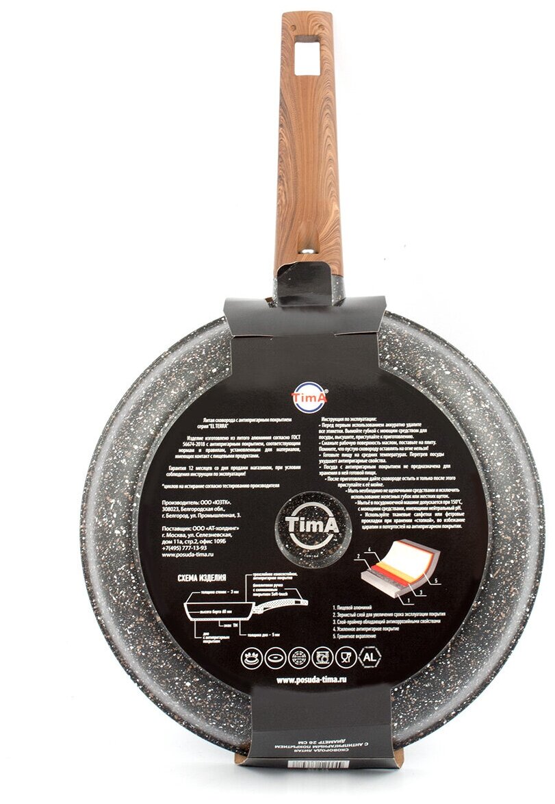 Сковороды серии «El Terra» торговой марки «TimA» подходят для всех видов плит, кроме индукционных, имеют высочайшие рабочие характеристики и идеально подходят для частого использования, они необычайно легки в эксплуатации и очень легко моются.