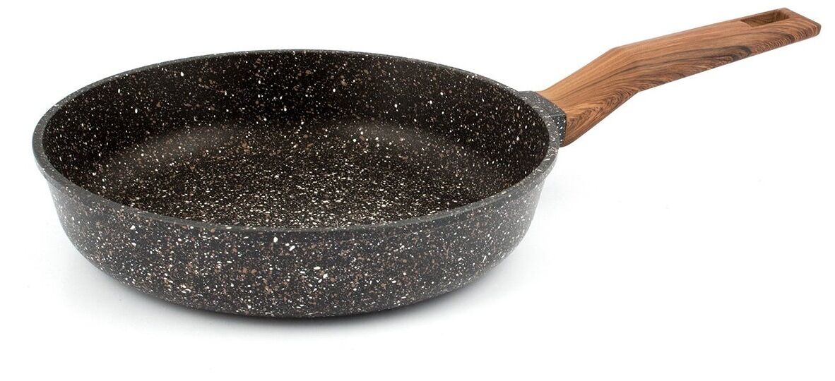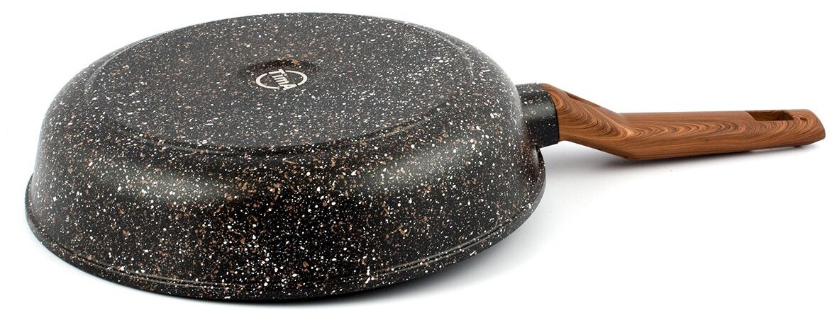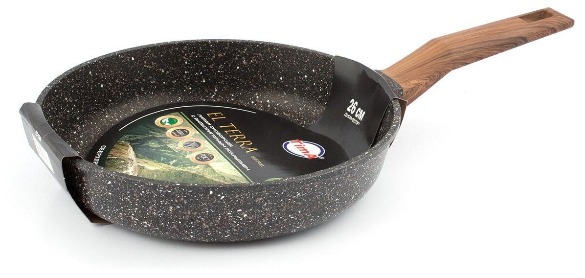 Внешний вид посуды серии «El Terra» торговой марки «TimA» никого не оставит равнодушным. Благородный гранитный цвет сковород достигается нанесением коричневой и белой крапушек, что обеспечивает его визуальное сходство с природным камнем. Дно сковороды полностью закрашено, что облегчает уход за сковородой и исключает повреждение варочных панелей.