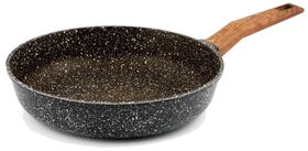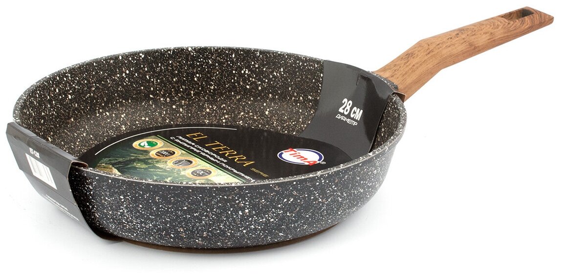 Внешний вид посуды серии «El Terra» торговой марки «TimA» никого не оставит равнодушным. Благородный гранитный цвет сковород достигается нанесением коричневой и белой крапушек, что обеспечивает его визуальное сходство с природным камнем. Дно сковороды полностью закрашено, что облегчает уход за сковородой и исключает повреждение варочных панелей.