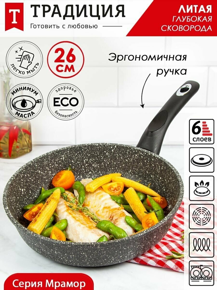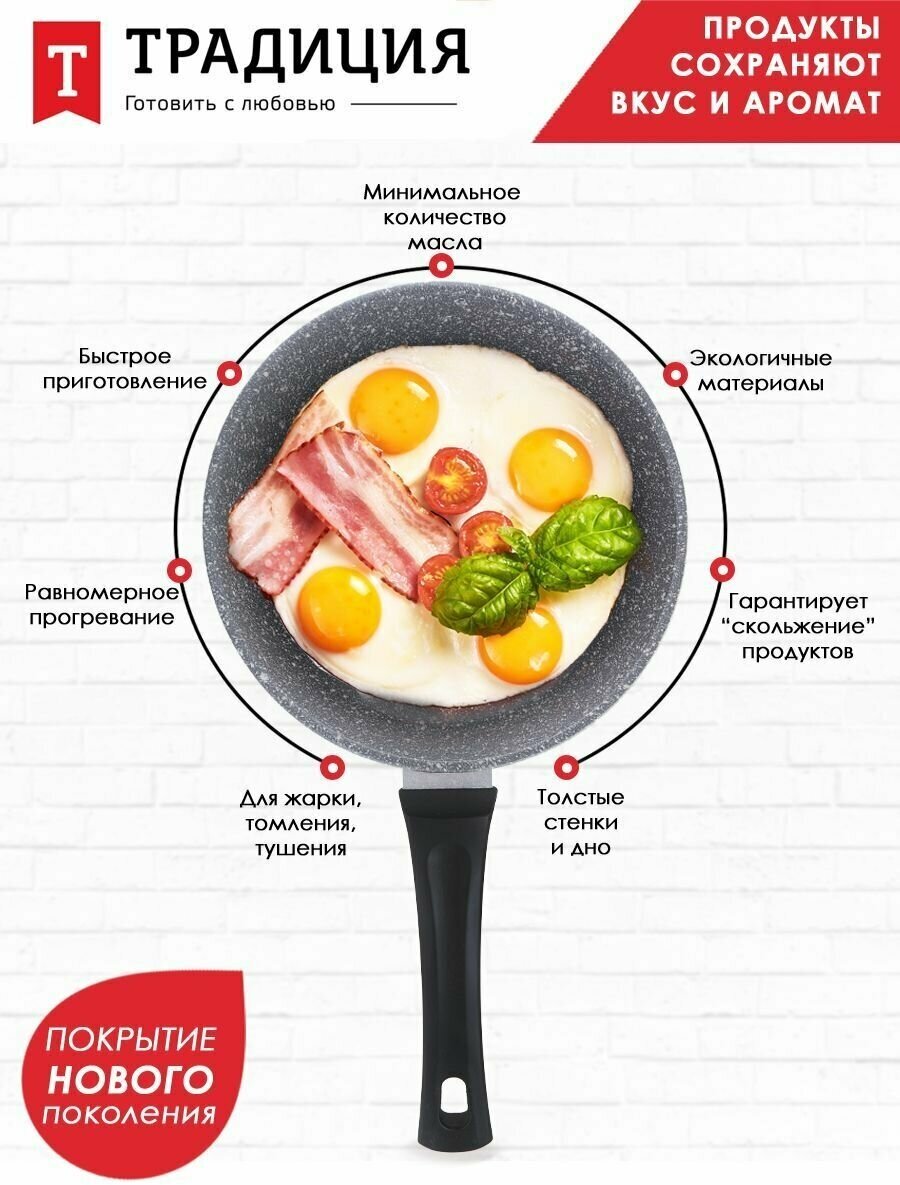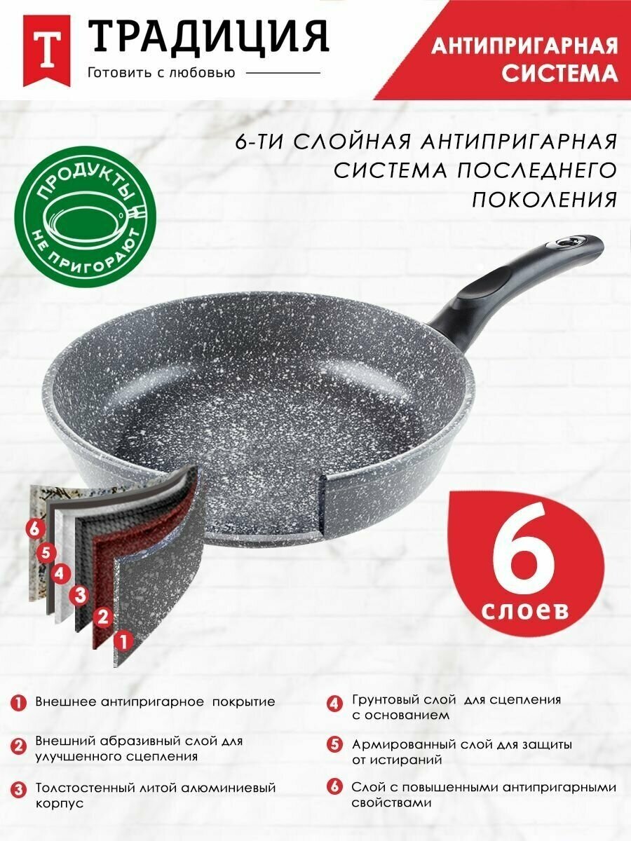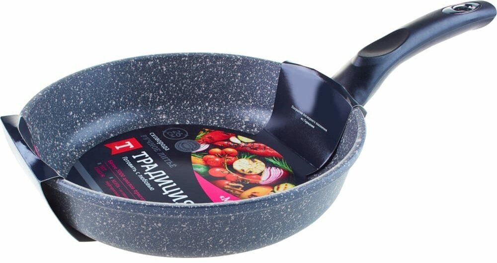 Литая сковорода с антипригарным покрытием ТМ "Традиция готовить с любовью". Посуда предназначена для ежедневного использования в домашних условиях. Исключительная прочность и долговечность антипригарного покрытия, равносильная по стойкости природному камню, разработана специально для интенсивного использования на каждый день. Толстостенный литой корпус. Пятислойная антипригарная система покрытия последнего поколения. Премиальное покрытие усиленное минеральными частицами. Два слоя дополнительной защиты от пригорания. Обладает хорошей антипригарностью для легкого и приятного приготовления здоровых блюд без масла и жира. Не менее 4000 тысяч циклов приготовления, при соблюдении правил эксплуатации. Сковороды со съемной ручкой ТМ Традиция можно использовать в духовом шкафу. Подходит для любых видов плит. Можно мыть в посудомоечной машине.
