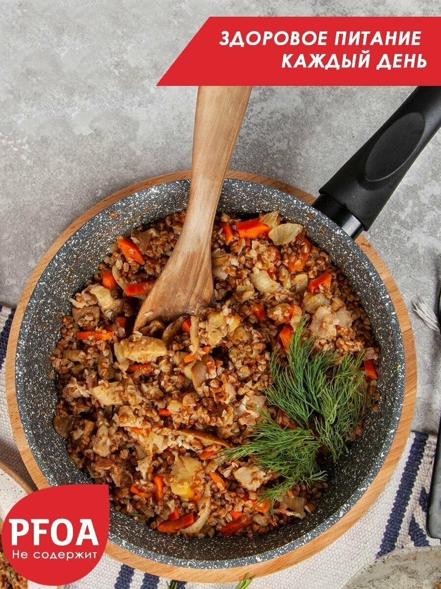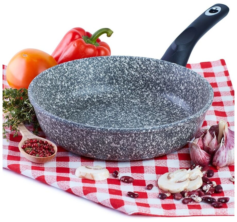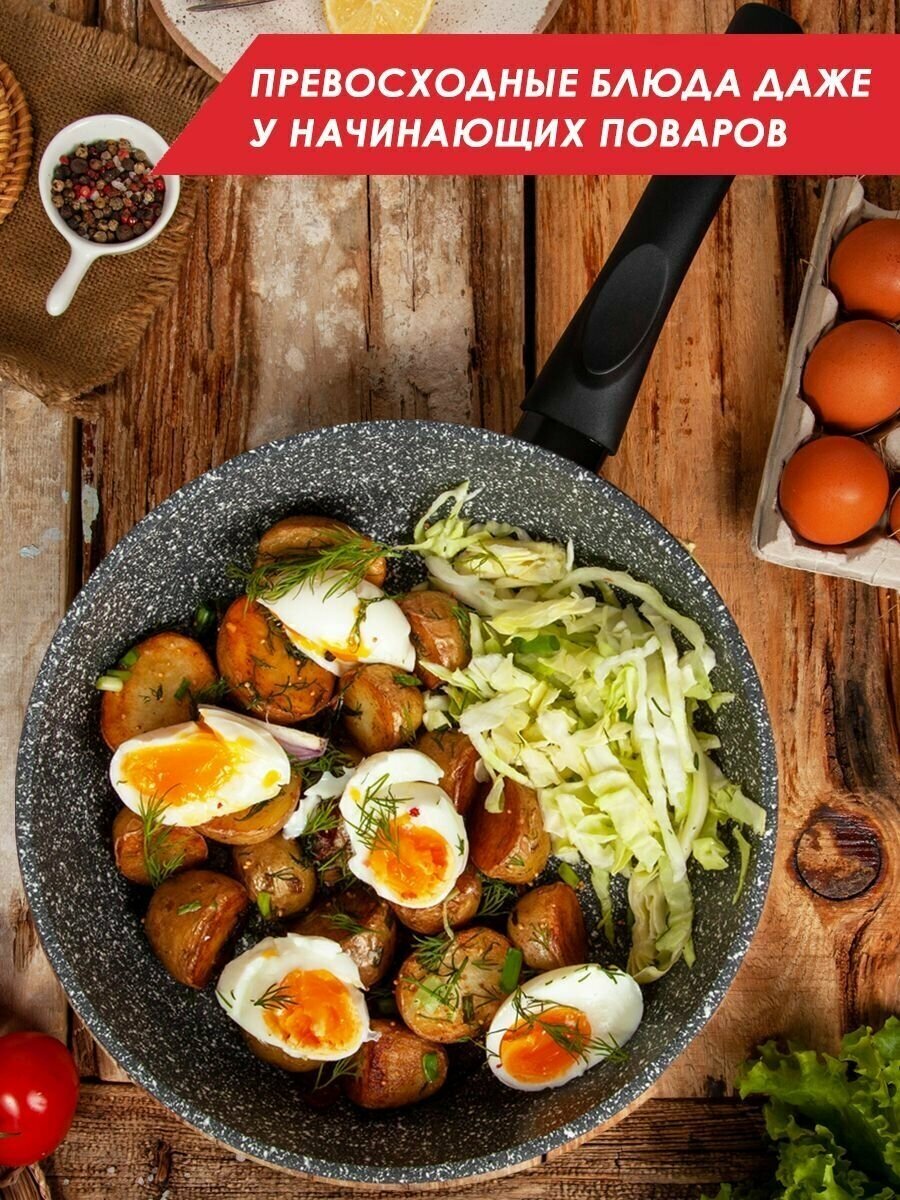Литая сковорода с антипригарным покрытием ТМ "Традиция готовить с любовью". Посуда предназначена для ежедневного использования в домашних условиях. Исключительная прочность и долговечность антипригарного покрытия, равносильная по стойкости природному камню, разработана специально для интенсивного использования на каждый день. Толстостенный литой корпус. Пятислойная антипригарная система покрытия последнего поколения. Премиальное покрытие усиленное минеральными частицами. Два слоя дополнительной защиты от пригорания. Обладает хорошей антипригарностью для легкого и приятного приготовления здоровых блюд без масла и жира. Не менее 4000 тысяч циклов приготовления, при соблюдении правил эксплуатации. Сковороды со съемной ручкой ТМ Традиция можно использовать в духовом шкафу. Подходит для любых видов плит. Можно мыть в посудомоечной машине.