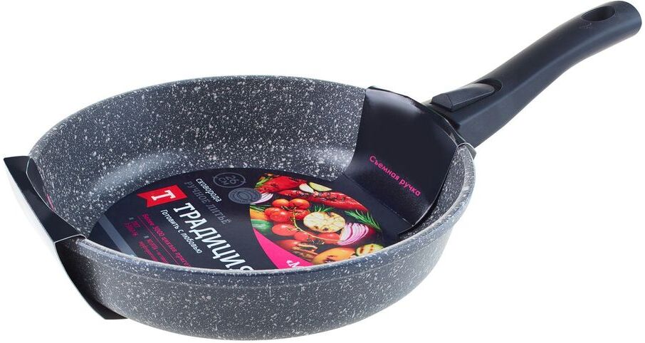 Литая сковорода со съемной ручкой и мраморным покрытием ТМ Традиция предназначена для ежедневного использования в домашних условиях. Прочное и долговечное антипригарное покрытие на водной основе разработано специально для данной линейки. Два слоя дополнительной защиты от пригорания.
