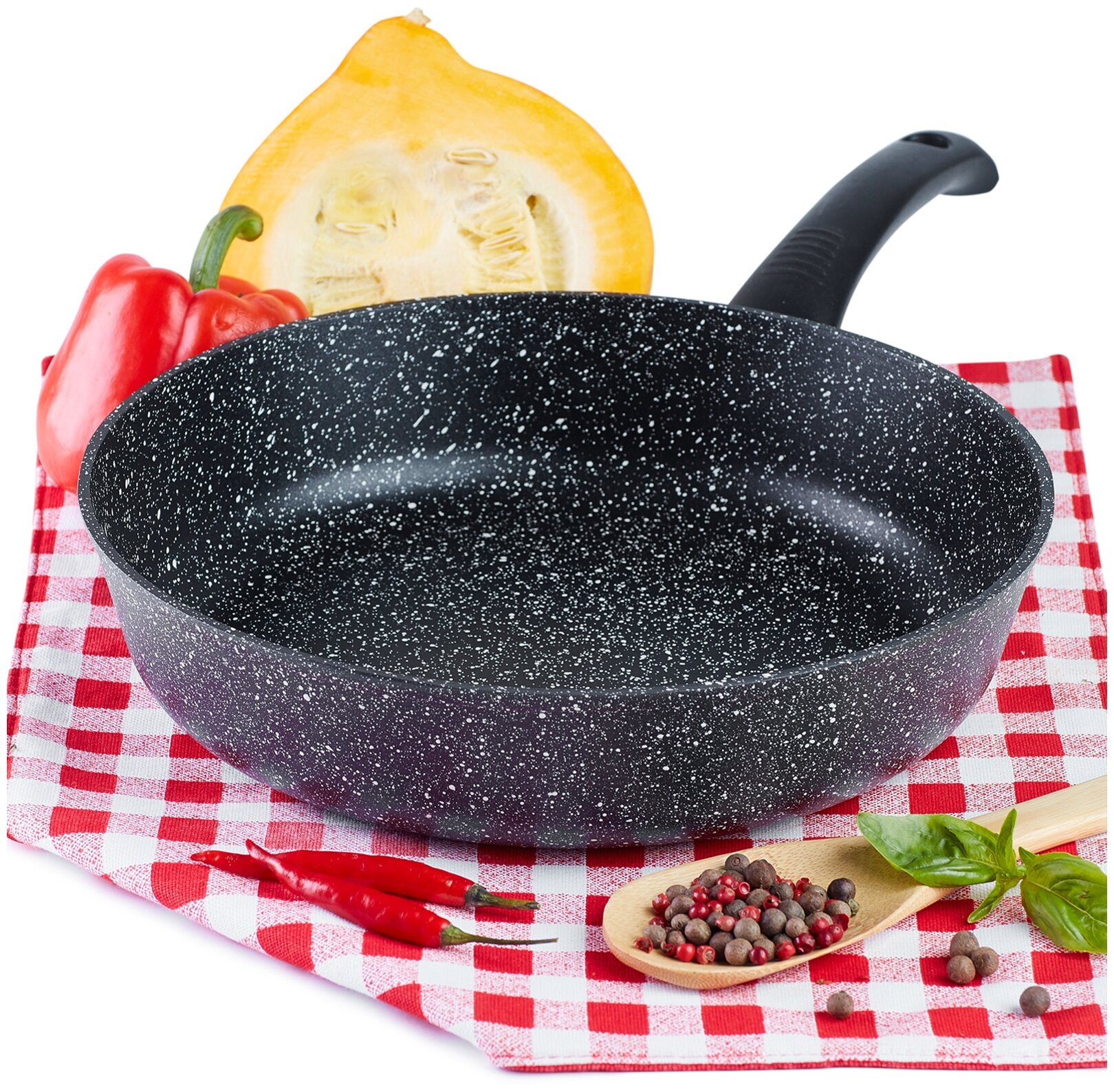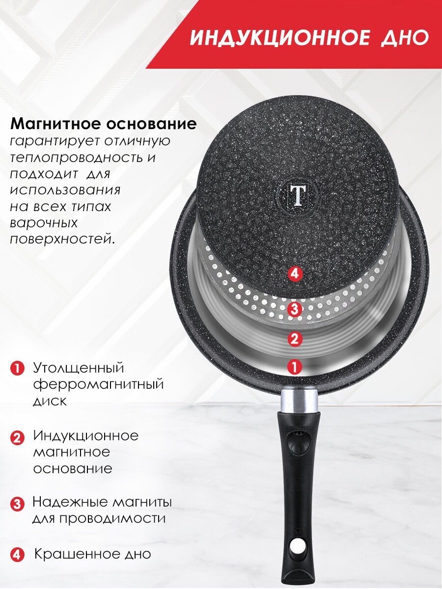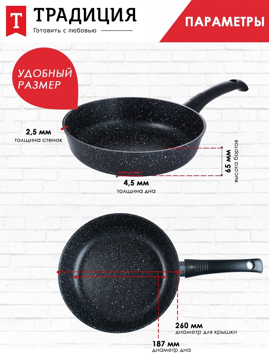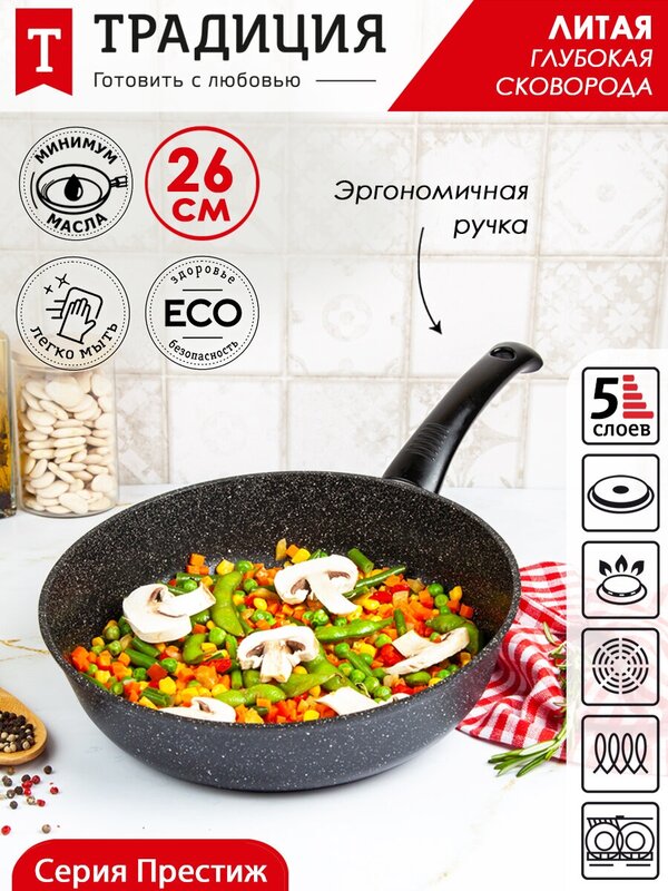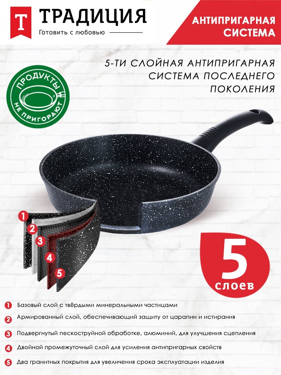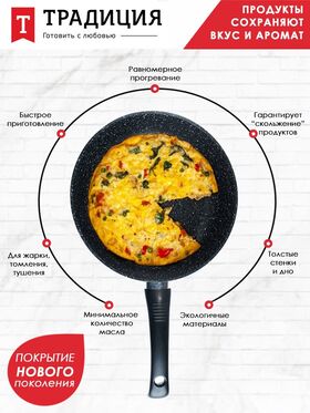 Литая посуда с антипригарным покрытием ТМ "Традиция готовить с любовью" отлично подойдет для жарки мяса или рыбы, тушения овощей, пассировки, приготовления жаркого и других блюд. Пища на такой посуде точно не пригорит и не прилипнет, приготовится быстро и равномерно, покроется аппетитной корочкой. Посуда изготовлена из литого алюминия высочайшего качества — материал отличается высокой прочностью, легок в эксплуатации. Литой корпус не деформируется при нагреве, утолщенное дно гарантирует прочность и долговечность посуды. Антипригарное покрытие не изменяет вкус и запах пищи, препятствует ее пригоранию. Оно позволяет готовить с меньшим количеством масла/жира, что делает готовое блюдо менее калорийным. Покрытие не содержит PFOA. Рукоятка soft touch не скользит и не нагревается, имеет эргономичную форму и удобно лежит в ладони. В ней предусмотрено отверстие для подвеса. Сковорода подходит для всех типов бытовых плит, в том числе и индукционных. Со сковородой от бренда «Традиция» Вы сможете воплотить в реальность любые понравившиеся рецепты и порадовать домашних вкуснейшими блюдами.