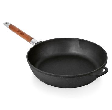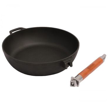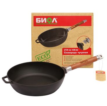 Сковорода чугунная со съемной ручкой Биол отличаются литым корпусом, съемной деревянной ручкой, весом и неповторимым качеством. Благодаря низкой теплопроводности материала, можно очень долго готовить блюда на малом огне, сковорода будет медленно нагреваться и также медленно остывать, позволяя блюдам не гореть, а жариться!