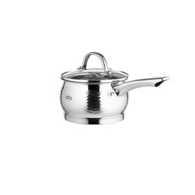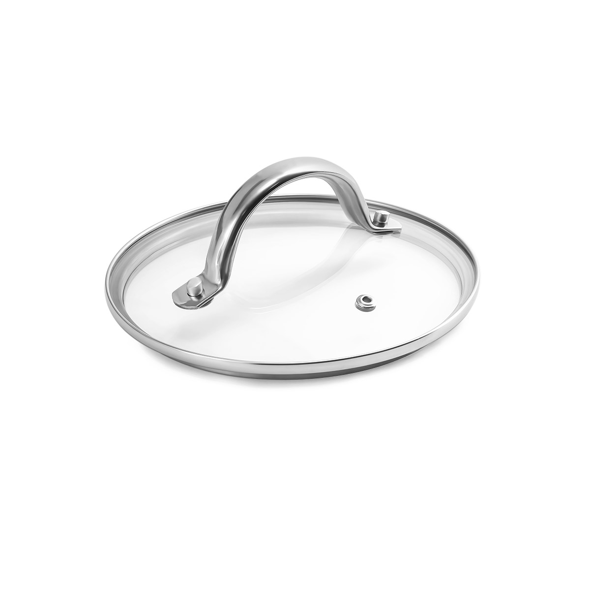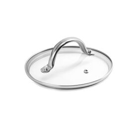 Крышка с паровыпуском изготовлена из жаропрочного стекла и имеет стальной обод G-формы, который плотно прилегает к стенкам сотейника. Полая ненагревающаяся ручка на прочных заклепках.