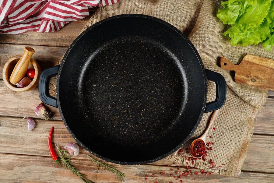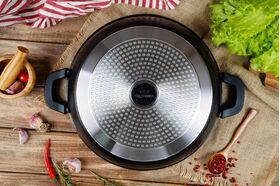 Жаровня с крышкой. Литой алюминий, стеклянная крышка с системой Aroma-фильтр, объем 3,5л, толщина 5мм, размер 28х7,5см, 3-х слойное антипригарное мраморное покрытие, 5-ти слойное теплоаккумулирующее дно, подходит для всех видов плит, можно мыть в посудомоечной машине, ручки с силиконовыми накладками