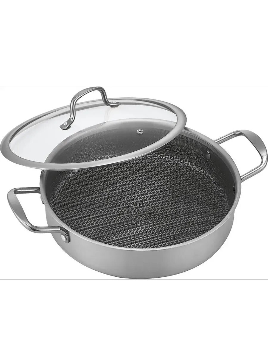 антипригарное покрытие, подходит для всех видов кухонных плит, в том числе индукционных, трёхслойный корпус