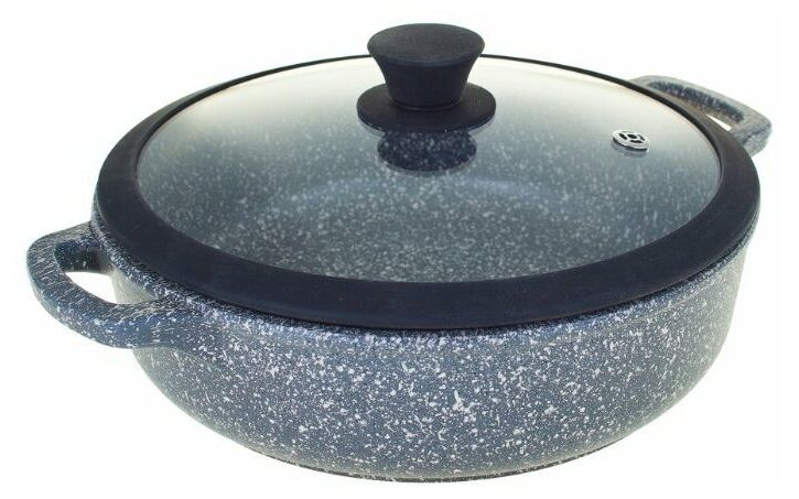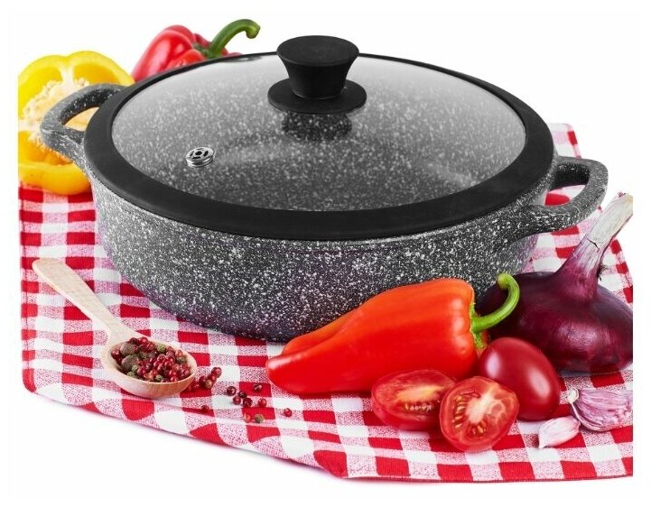 Литая посуда с антипригарным покрытием ТМ традиция Мрамор отлично подойдет для жарки мяса или рыбы, тушения овощей, пассировки, приготовления жаркого и других блюд.