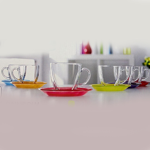 Оригинальный набор с прозрачными чашками и квадратными блюдцами разных цветов.