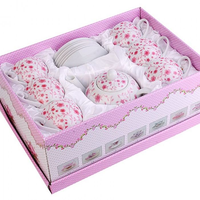 Чайный набор LORAINE на 6 персон выполнен из фарфора высокого качества и оформлен красивым цветочным рисунком. Изящный дизайн придется по вкусу и ценителям классики, и тем, кто предпочитает утонченность и изысканность. Набор упакован в стильную подарочную коробку, оформленную изнутри белой атласной тканью. Каждый предмет надежно зафиксирован внутри коробки благодаря специальным выемкам. Чайный набор - идеальный и необходимый подарок для Вашего дома и для Ваших друзей в праздники, юбилеи и торжества! Также он станет отличным корпоративным подарком и украшением любой кухни. Подходит для мытья в посудомоечной машине. В наборе: 6 чашек, 6 блюдец и заварочный чайник.