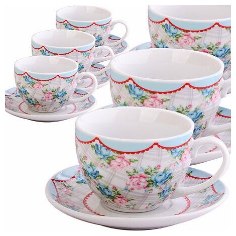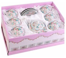 Чайный набор LORAINE на 6 персон выполнен из фарфора высокого качества и оформлен красивым цветочным рисунком. Изящный дизайн придется по вкусу и ценителям классики, и тем, кто предпочитает утонченность и изысканность. Набор упакован в стильную подарочную коробку, оформленную изнутри белой атласной тканью. Каждый предмет надежно зафиксирован внутри коробки благодаря специальным выемкам. Чайный набор - идеальный и необходимый подарок для Вашего дома и для Ваших друзей в праздники, юбилеи и торжества! Также он станет отличным корпоративным подарком и украшением любой кухни. Подходит для мытья в посудомоечной машине. В наборе: 6 чашек, 6 блюдец и заварочный чайник.