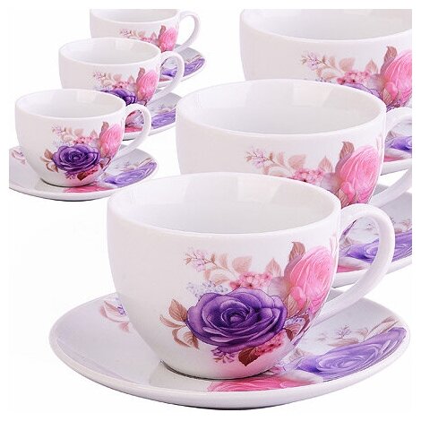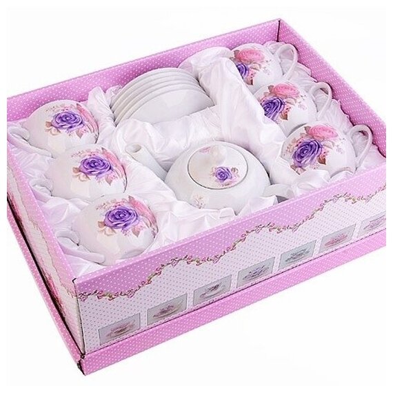 Чайный набор LORAINE на 6 персон выполнен из фарфора высокого качества и оформлен красивым цветочным рисунком. Изящный дизайн придется по вкусу и ценителям классики, и тем, кто предпочитает утонченность и изысканность. Набор упакован в стильную подарочную коробку, оформленную изнутри белой атласной тканью. Каждый предмет надежно зафиксирован внутри коробки благодаря специальным выемкам. Чайный набор - идеальный и необходимый подарок для Вашего дома и для Ваших друзей в праздники, юбилеи и торжества! Также он станет отличным корпоративным подарком и украшением любой кухни. Подходит для мытья в посудомоечной машине. В наборе: 6 чашек, 6 блюдец и заварочный чайник.