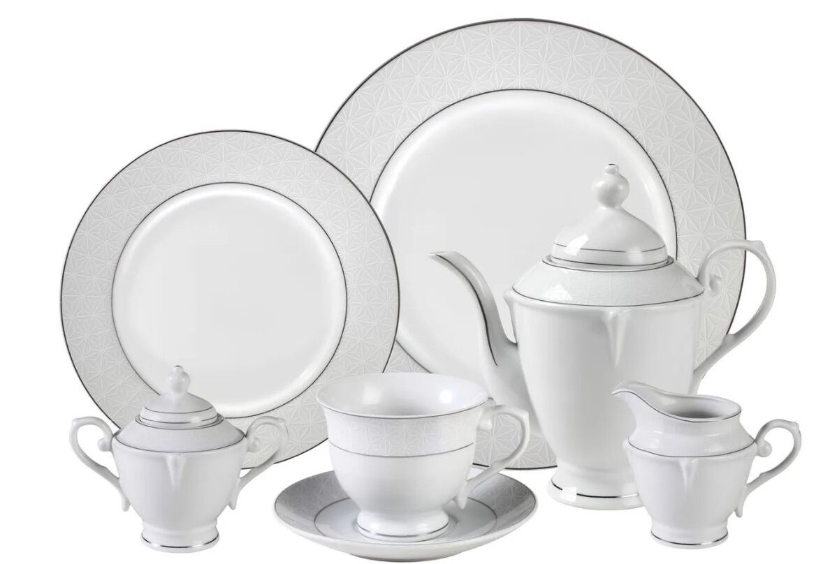 "В сервиз входят: Чашка – 6 шт. (200 мл); Блюдце – 6 шт. (Ø 14,0 см); Чайник заварочный с крышкой – 1 шт. (1300 мл); Сахарница с крышкой – 1 шт. (400 мл); Сливочник – 1 шт. (330 мл); Тарелка обеденная – 1 шт. (Ø 26,7 см); Тарелка десертная – 6 шт. (Ø 19,0 см); Состав: фарфор. Подходит для чистки в посудомоечной машине."