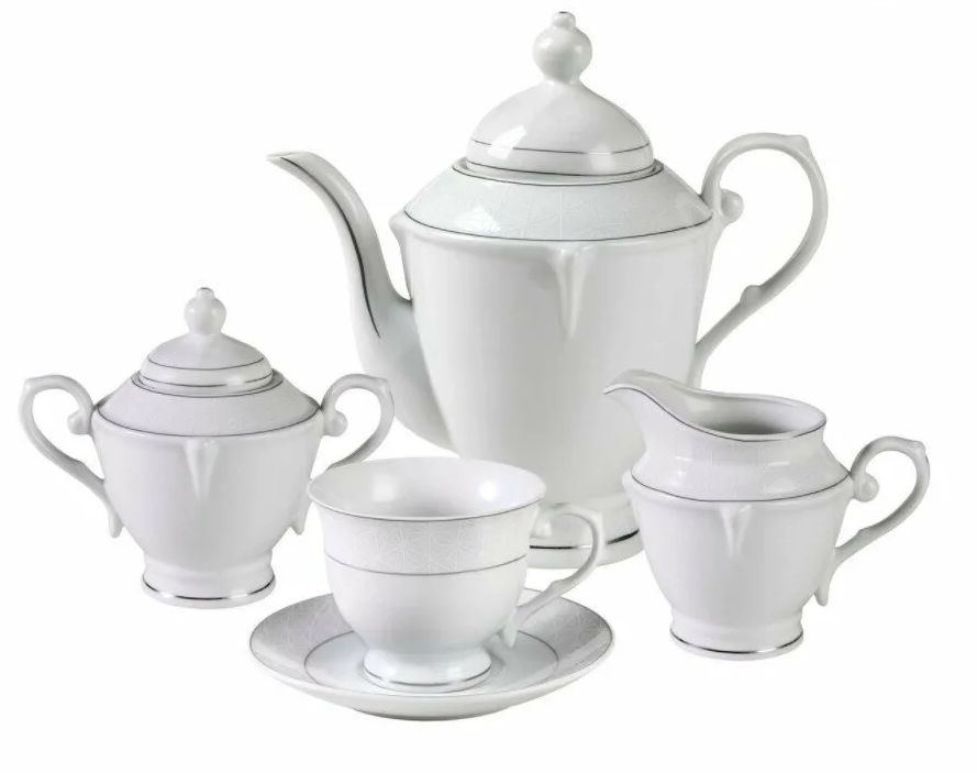 Чайный сервиз из 27 предметов. В сервиз входят: Чашка для чая – 6 шт. (200 мл) Блюдце – 6 шт. (14,0 см) Чашка для кофе – 6 шт. (90 мл) Блюдце – 6 шт. (11,4 см) Чайник заварочный с крышкой – 1 шт. (1300 мл) Сахарница с крышкой – 1 шт. (400 мл) Сливочник – 1 шт. (330 мл) Подходит для чистки в посудомоечной машине. Состав: фарфор.