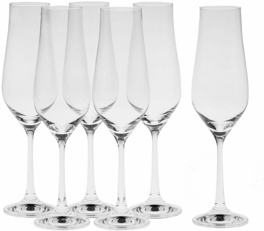 Набор бокалов для шампанского в красивой подарочной упаковке - комплект изысканной посуды из высококлассного стекла, для сервировки праздничного и обеденного стола, особых случаев и на каждый день. Большие бокалы для игристого вина вытянутой формы, с тонким полированным краем, из высококлассного стекла повышенной прочности, с единой чашей и ножкой без швов, на изящном и устойчивом основании. Каждый фужер удобно лежит в руке, сохраняет вкус и аромат напитка. Бокалы для шампанского оформлены с продуманным расширением чаши и с узким горлышком. Благодаря такой форме фужеры медленно раскрывают аромат и букет вкуса игристого винного напитка, позволяя насладиться шампанским.