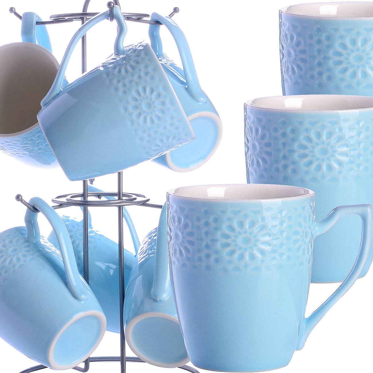 Чайный набор состоит из 6 чашек и 1 металлической подставки. Предметы набора изготовлены из высококачественного фарфора. Изящный дизайн с рельефной отделкой придется по вкусу и ценителям классики, и тем, кто предпочитает утонченность и изысканность. Он настроит на позитивный лад и подарит хорошее настроение с самого утра. Набор кружек - идеальный и необходимый подарок для вашего дома и для ваших друзей в праздники. В комплекте - металлическая подставка с шестью крючками для подвешивания кружек.