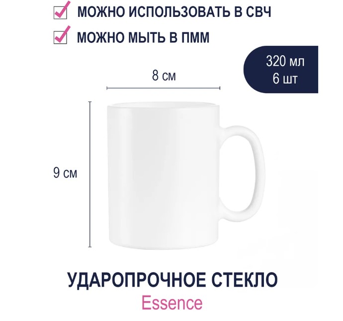 Набор кружек 6 штук, Luminarc Essence White 320 мл, набор посуды, кружка, чашка. Набор кружек из ударопрочного опалового стекла пригодится в большой семье, дружном коллективе, небольшом кафе. Простая классическая форма и обычный белый цвет делают кружку пригодной для повседневного использования. Наличие комплекта из шести одинаковых кружек позволит легко сервировать стол для чаепития, дружеского обеда. Главным преимуществом продукции Luminarc является ее практичность. Благодаря уникальным свойствам материала, стеклянные кружки Essence White служат десятилетиями, не доставляя никаких хлопот хозяйкам. Их можно использовать для разогрева жидкостей в микроволновке, они пригодны для мытья в посудомоечных машинах. На поверхностях не образуются микротрещины, не скапливается темный налет, не задерживаются бактерии. Чашки подходят для любых холодных и горячих напитков. Ищете подарок для родителей, друзей, родственников? Тогда вам стоит купить набор из 6 кружек Luminarc Essence White, который понравится любой хозяйке.