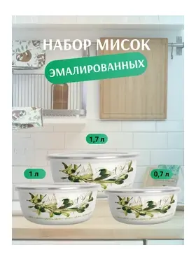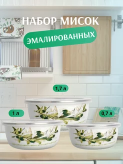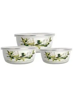 Набор мисок ZEIDAN , 6 предметов, (3 МИСКИ С КРЫШКАМИ: 1) 0,7 л. высота 6 см. диаметр 14 см), 2) 1,0 л. высота 6,5 см. диаметр 16 см), 2) 1,7 л. высота 8 см. диаметр 18 см) с внутренним эмалированным покрытием), эмалированная сталь, внешнее покрытие - эмаль с рисунком.