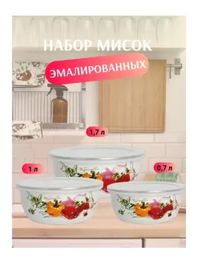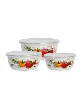 Набор мисок ZEIDAN , 6 предметов, (3 МИСКИ С КРЫШКАМИ: 1) 0,7 л. высота 6 см. диаметр 14 см), 2) 1,0 л. высота 6,5 см. диаметр 16 см), 2) 1,7 л. высота 8 см. диаметр 18 см) с внутренним эмалированным покрытием), эмалированная сталь, внешнее покрытие - эмаль с рисунком. Подарочная упаковка.