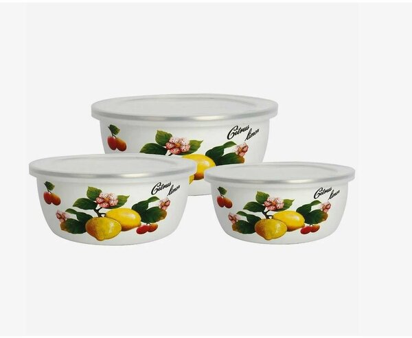 Набор мисок ZEIDAN , 6 предметов, (3 МИСКИ С КРЫШКАМИ 1) 0,85 л. высота 6 см. диаметр 16 см), 2) 1,4 л, высота 7,5 см. диаметр 18 см), 3) 2,6 л. высота 8,5 см. диаметр 20 см) с внутренним эмалированным покрытием), эмалированная сталь, внешнее покрытие - эмаль с рисунком. Подарочная упаковка.