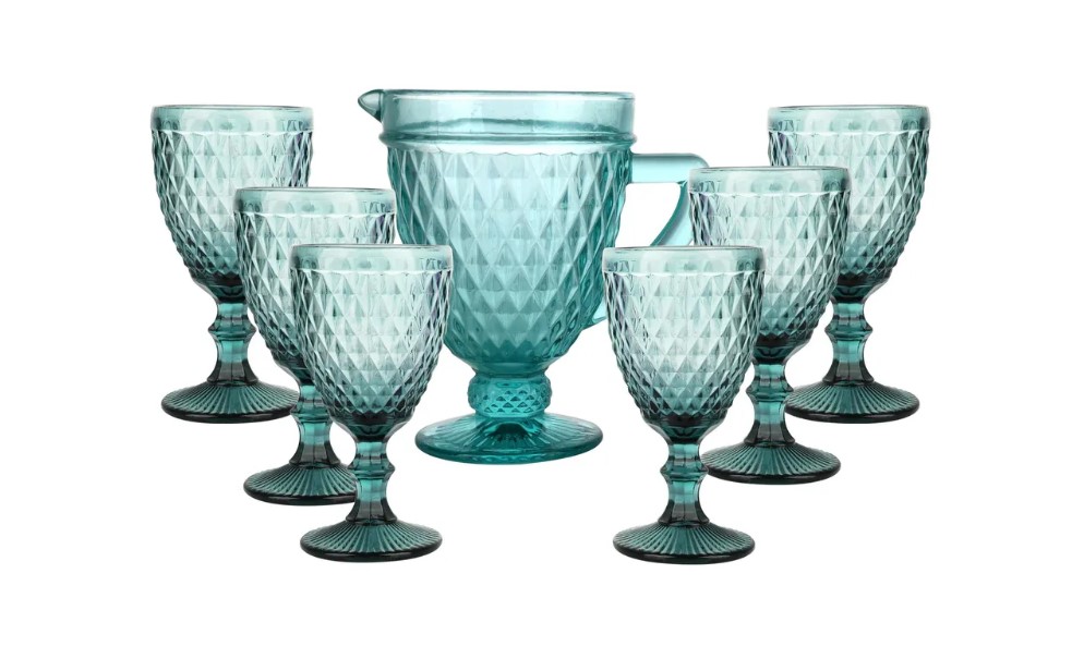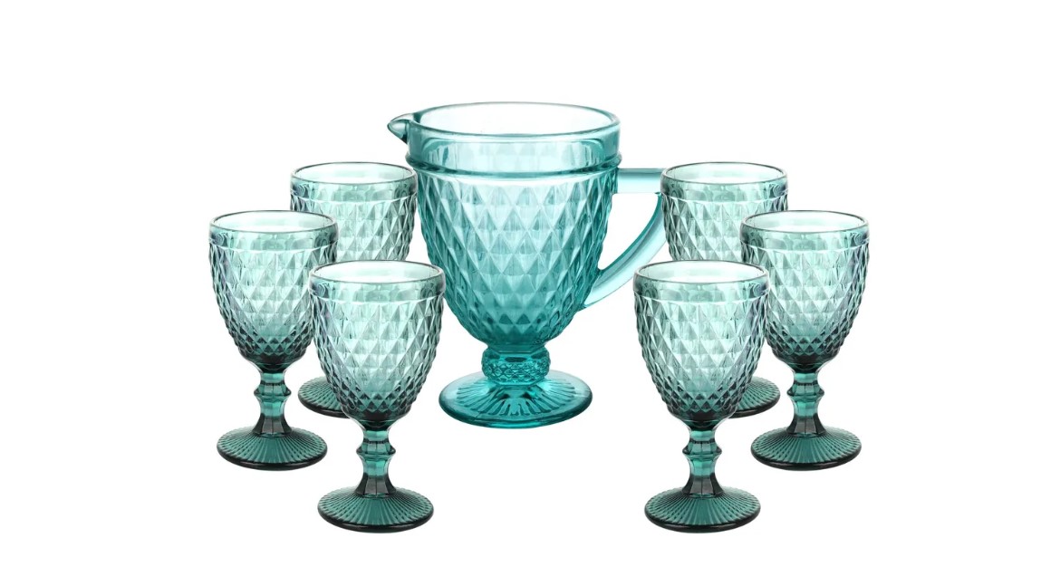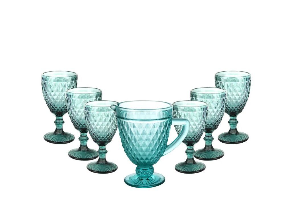 Набор для сока, воды, вина, напитков. Кувшин и шесть бокалов создают элегантную атмосферу. Емкость кувшина 1,3л, бокалов 324мл. Набор представлен в пяти цветовых вариантах лаконичном черном, изысканном голубом, нежном розовым, драгоценном бирюзовом и элегантном зеленом. Набор украсит как повседневный так и праздничный стол. Строгие, лаконичные линии дизайна обращают на себя внимание стилем и оригинальностью исполнения. Набор может послужить хорошим подарком для друзей и знакомых, родных и близких людей.