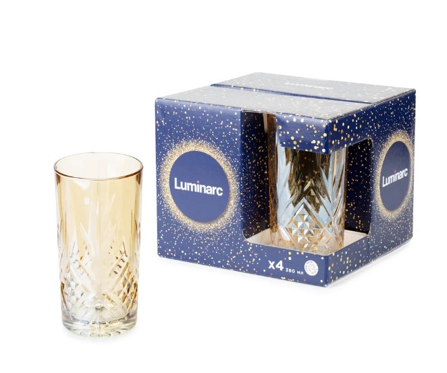 Набор высоких стаканов Luminarc Salzburg (Зальцбург) Золотой мед. Стаканы изготовлены из прозрачного закаленного стекла, без рисунка с гранением.