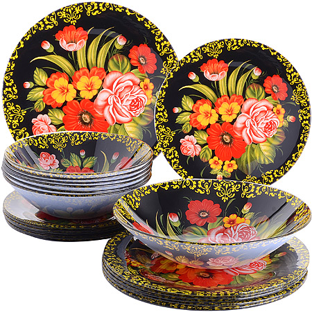 В набор входит 6 десертных тарелок, 6 глубоких тарелок, 6 больших тарелок и 1 большая салатница. Подходит для мытья в посудомоечной машине. Набор посуды 19 пр LR (х2). Форма: круглая. Рисунок: цветы. Цвет: черный, зелёный, красный, жёлтый. Материал: стекло. 6 десертных тарелок: D18 см. 6 больших тарелок: D 23 см. 6 глубоких тарелок: D18,5 х 5 см. 1 салатница: D 22,5 х 5,5 см. Вес: 5,47 кг. Размер упаковки: 24,7 х 20,6 х 25,1 см. Страна производитель: Китай.