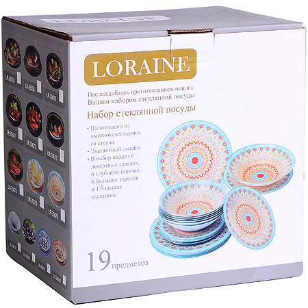 Набор посуды LORAINE выполнен из стекла и декорирован красочным орнаментом. Данный набор предназначен для сервировки обеденного стола на 6 персон. Форма изделий круглая. Классический дизайн сочетается в нем с максимальной функциональностью. Такой набор послужит отличным подарком к любому празднику, а также добавит элегантности и уюта любому праздничному столу! Посуда обладает гладкой непористой поверхностью, не впитывает запахи, устойчива к перепадам температуры и легко моется. В набор входит 6 десертных тарелок, 6 глубоких тарелок, 6 больших тарелок и 1 большая салатница. Не подходит для мытья в посудомоечной машине.