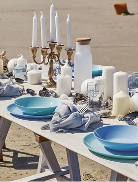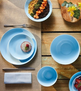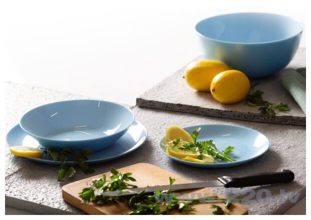 Стеклянный сервиз с большим глубоким салатником нежного голубого цвета - сочетание невысокой цены и модных тенденций в сервировке. Если хотите получить необычное оформление вашего торжества - скомбинируйте с белым или лазурным Diwali Light Turquoise. Закаленное стекло устойчиво к сколам, гигиенично, легко моется.