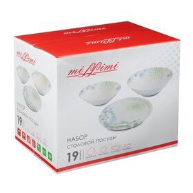Сервировку праздничного стола «под ключ» обеспечит набор столовой посуды MILLIMI «Асиано» из опалового стекла с цветочным рисунком на белом фоне. Набор состоит из 19 предметов. Это качественная посуда для повседневного использования, а также для праздничного стола. Посуда имеет повышенную прочность и устойчивость к механическим воздействиям, не царапается от столовых приборов. Легко отмывается, не окрашиваясь от продуктов.
