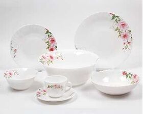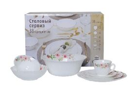 Комплектация: - Салатник 22 см: 2 шт; - Салатник 12,6 см: 6 шт; - Обеденная тарелка 23 см: 6 шт; - Десертная тарелка 19 см: 6 шт; - Суповая тарелка 17,5 см: 6 шт; - Чайная пара (чашка - 190 мл, блюдце – 13 см): 6 шт